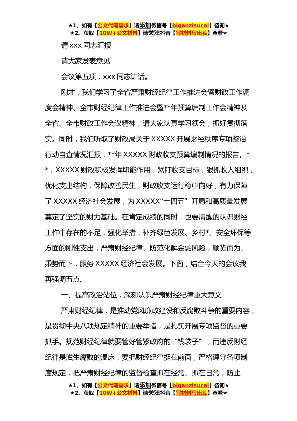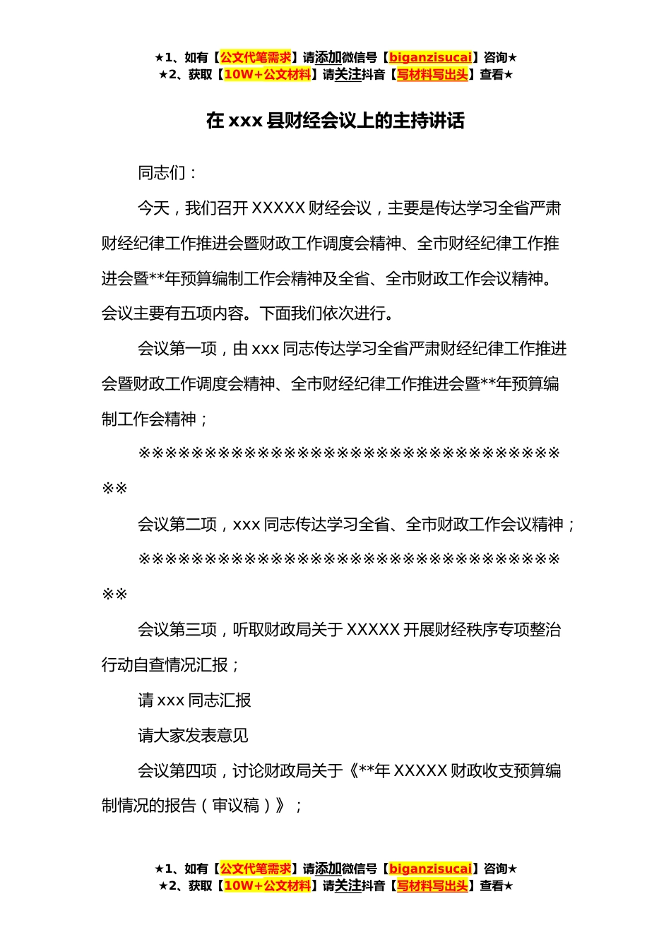 ★1、如有【公文代笔需求】请添加微信号【biganzisucai】咨询★★2、获取【10W+公文材料】请关注抖音【写材料写出头】查看★在xxx县财经会议上的主持讲话同志们:今天,我们召开XXXXX财经会议,主要是传达学习全省严肃财经纪律工作推进会暨财政工作调度会精神、全市财经纪律工作推进会暨**年预算编制工作会精神及全省、全市财政工作会议精神。会议主要有五项内容。下面我们依次进行。会议第一项,由xxx同志传达学习全省严肃财经纪律工作推进会暨财政工作调度会精神、全市财经纪律工作推进会暨**年预算编制工作会精神;※※※※※※※※※※※※※※※※※※※※※※※※※※※※※※※※※※会议第二项,xxx同志传达学习全省、全市财政工作会议精神;※※※※※※※※※※※※※※※※※※※※※※※※※※※※※...