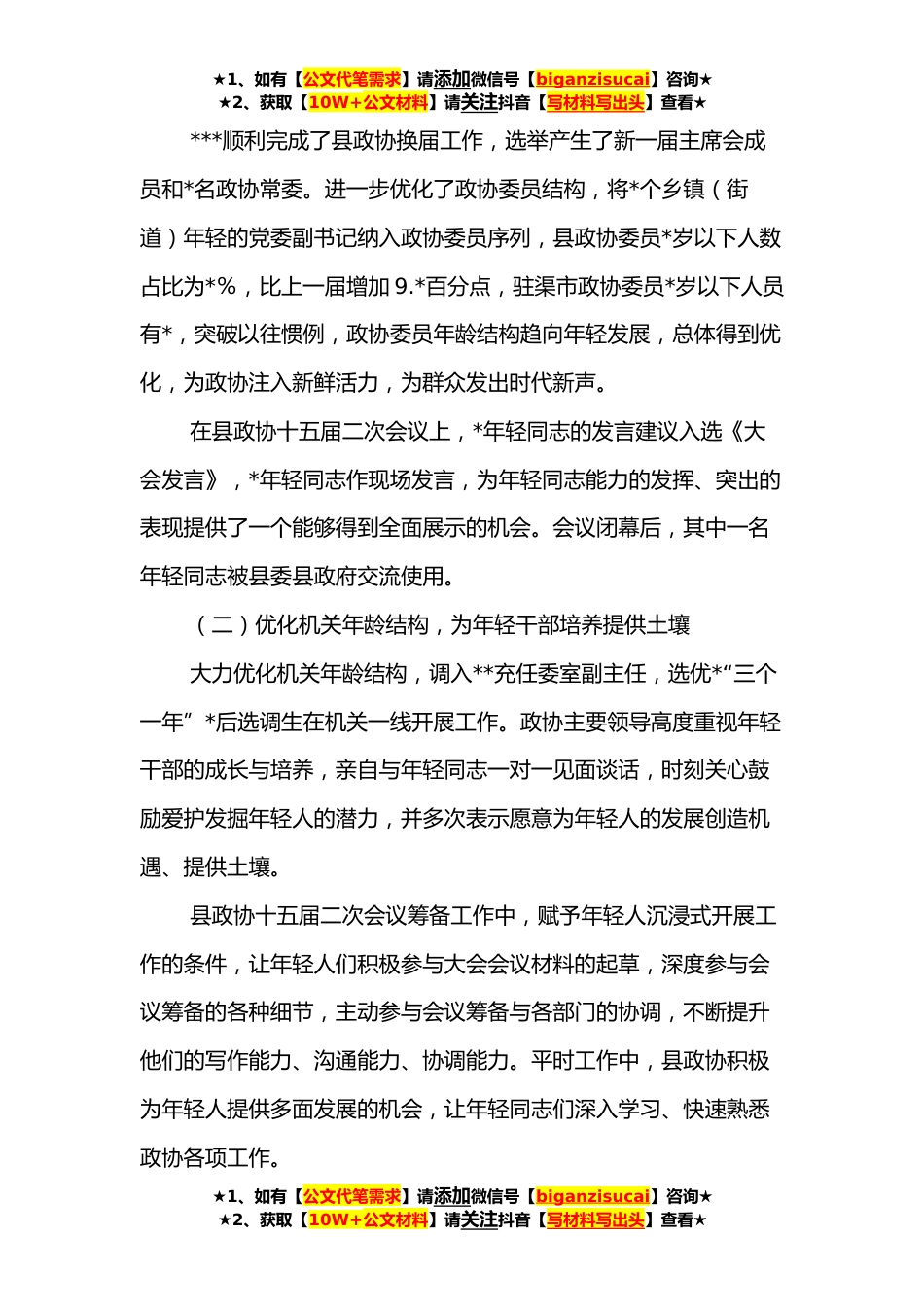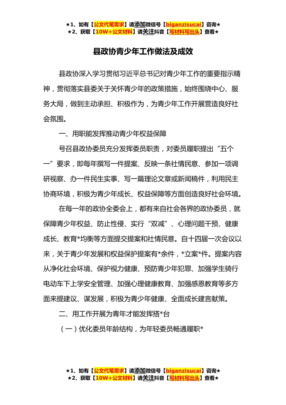 ★1、如有【公文代笔需求】请添加微信号【biganzisucai】咨询★★2、获取【10W+公文材料】请关注抖音【写材料写出头】查看★县政协青少年工作做法及成效县政协深入学习贯彻习近平总书记对青少年工作的重要指示精神,贯彻落实县委关于关怀青少年的政策措施,始终围绕中心、服务大局,做到主动承担、积极作为,为青少年工作开展营造良好社会氛围。一、用职能发挥推动青少年权益保障号召县政协委员充分发挥委员职责,对委员履职提出“五个一”要求,即每年撰写一件提案、反映一条社情民意、参加一项调研视察、办一件民生实事、写一篇理论文章或新闻稿件,利用民主协商环境,积极为青少年成长、权益保障等方面创造良好社会环境。在每一年的政协全委会上,都有来自社会各界的政协委员,就保障青少年权益、防止性侵、实...