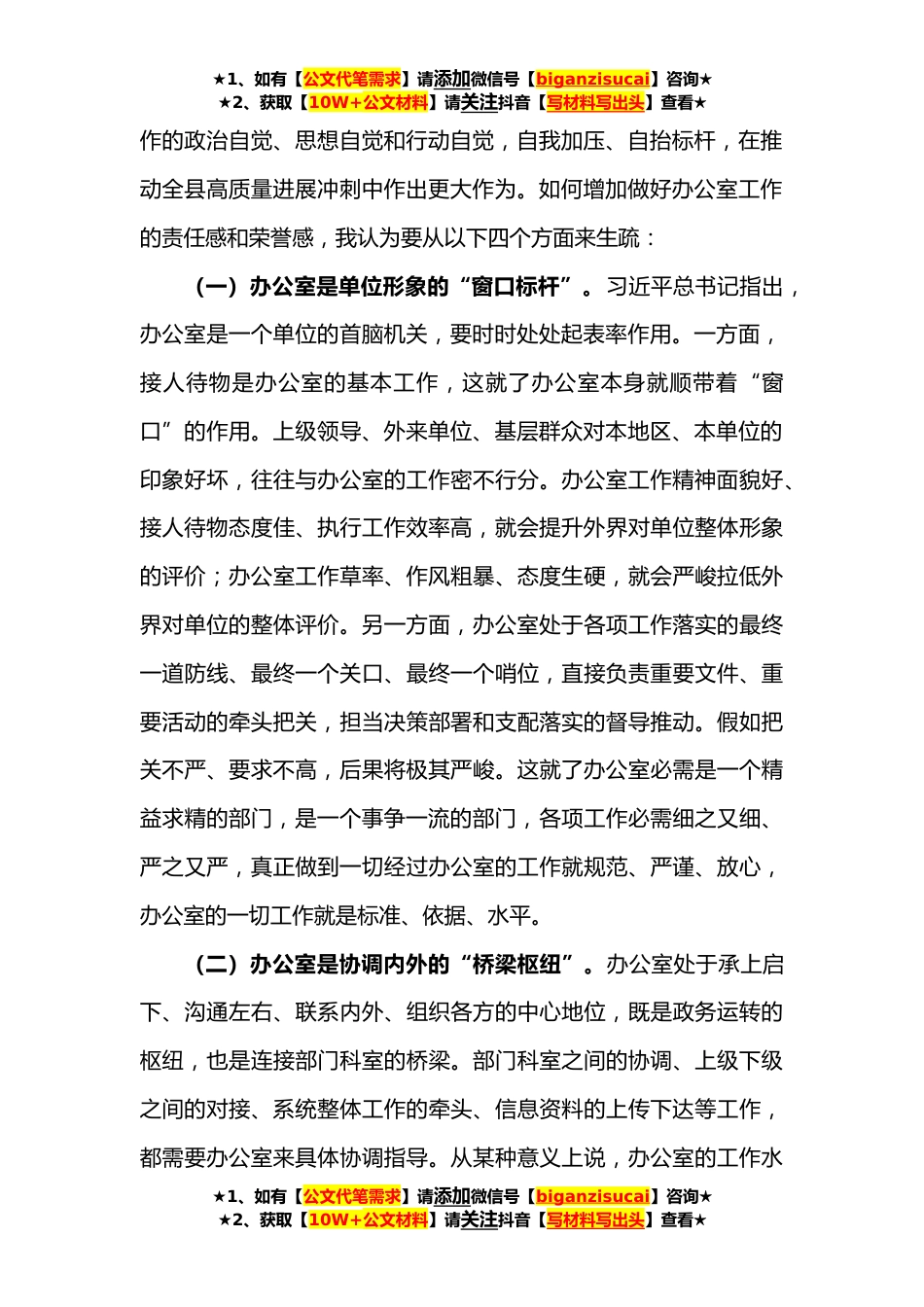 ★1、如有【公文代笔需求】请添加微信号【biganzisucai】咨询★★2、获取【10W+公文材料】请关注抖音【写材料写出头】查看★县委办主任在办公室工作会议上的讲话同志们:这次办公室工作会议,是经县委争辩召开的,主要任务是分析争辩当前我县办公室工作面临的新形势、新任务,进一步统一思想、转变作风、提高效率,全面提升办公室系统“三服务”水平,为推动全县高质量进展做出新贡献。县委书记xxx同志对召开这次会议高度重视,会前特地听取了会议筹备状况的汇报,并就做好办公室工作提出了明确要求和殷切期望。刚才,xxx同志传达了xxx书记的批示精神,xx位副主任结合分管工作分别做了支配,期望大家认真领悟,切实抓好贯彻落实。下面,依据县委主要领导同志*四大班子办公室主任联席会议争辩的意见,我讲以下几个...