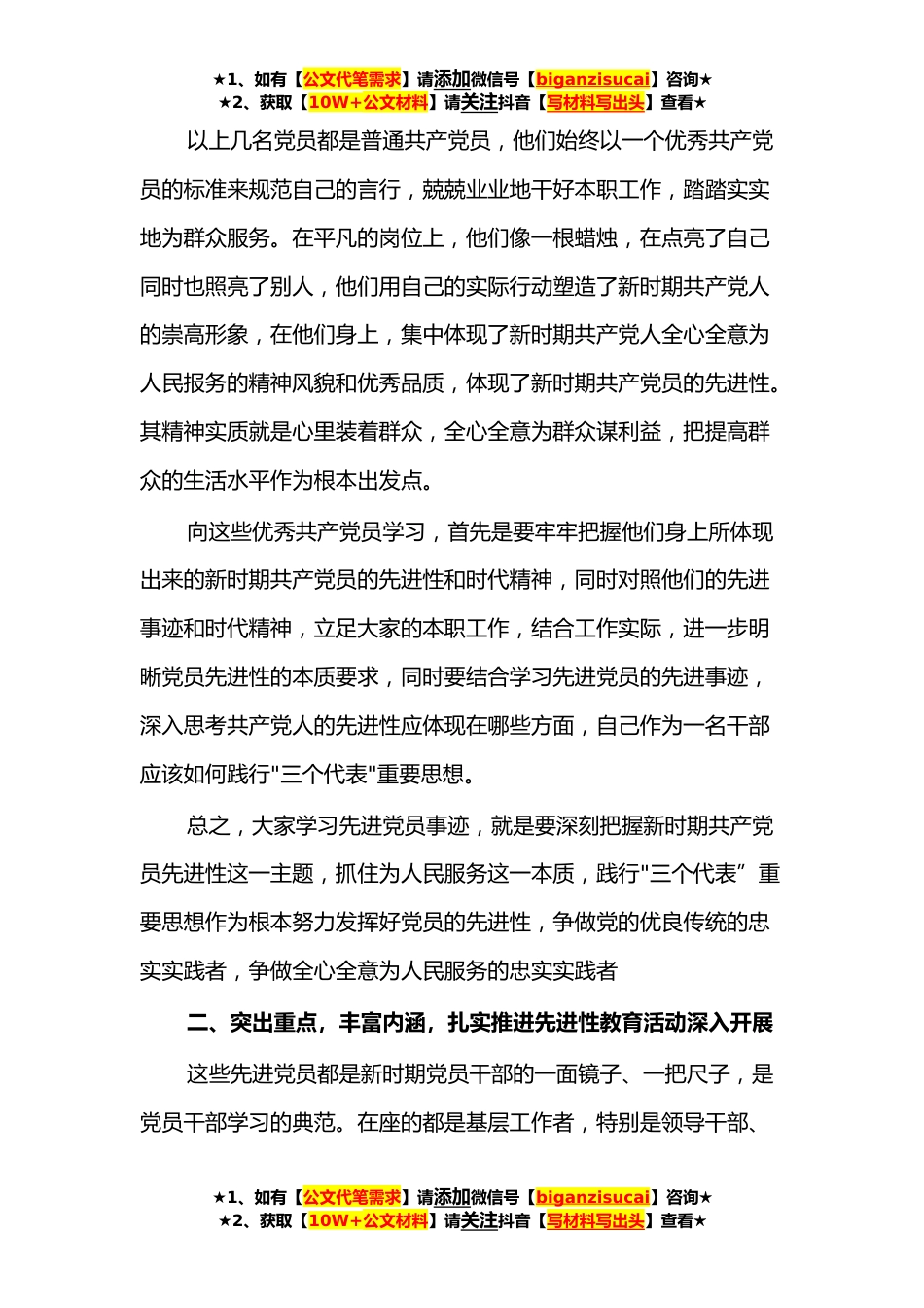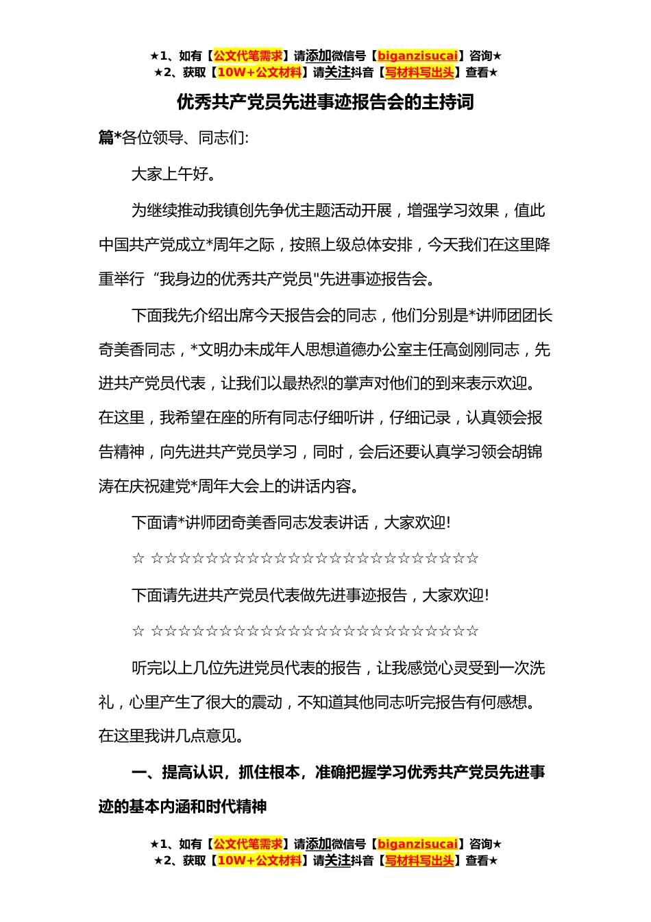 ★1、如有【公文代笔需求】请添加微信号【biganzisucai】咨询★★2、获取【10W+公文材料】请关注抖音【写材料写出头】查看★优秀共产党员先进事迹报告会的主持词篇*各位领导、同志们:大家上午好。为继续推动我镇创先争优主题活动开展,增强学习效果,值此中国共产党成立*周年之际,按照上级总体安排,今天我们在这里降重举行“我身边的优秀共产党员"先进事迹报告会。下面我先介绍出席今天报告会的同志,他们分别是*讲师团团长奇美香同志,*文明办未成年人思想道德办公室主任高剑刚同志,先进共产党员代表,让我们以最热烈的掌声对他们的到来表示欢迎。在这里,我希望在座的所有同志仔细听讲,仔细记录,认真领会报告精神,向先进共产党员学习,同时,会后还要认真学习领会胡锦涛在庆祝建党*周年大会上的讲话内容。...