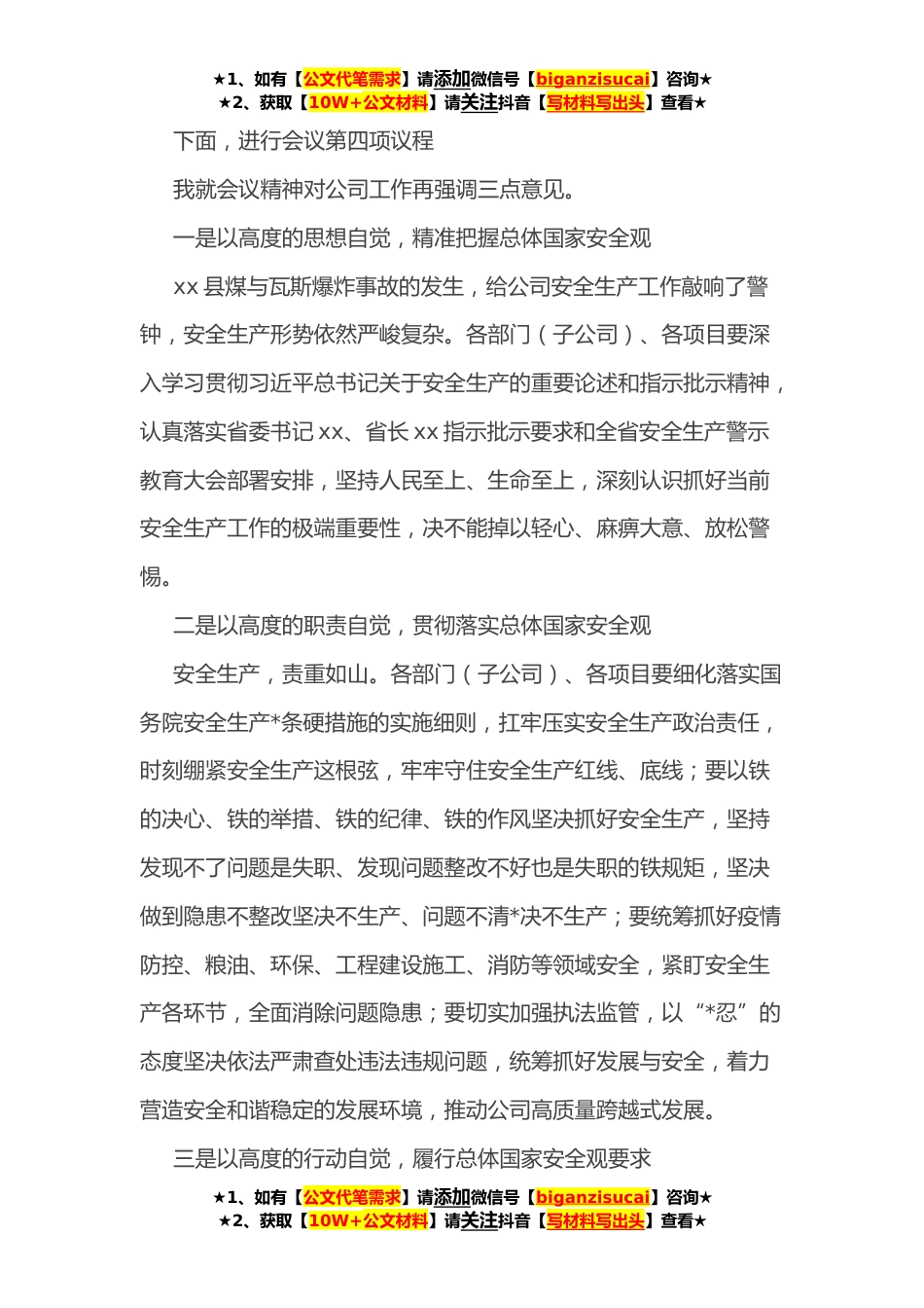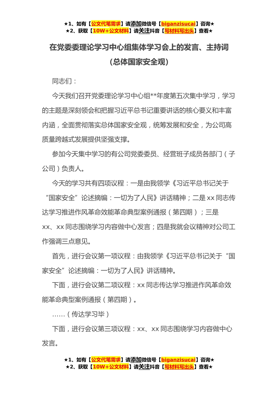 ★1、如有【公文代笔需求】请添加微信号【biganzisucai】咨询★★2、获取【10W+公文材料】请关注抖音【写材料写出头】查看★在党委委理论学习中心组集体学习会上的发言、主持词(总体国家安全观)同志们:今天我们召开党委理论学习中心组**年度第五次集中学习,学习的主题是深刻领会和把握习近平总书记重要讲话的核心要义和丰富内涵,全面贯彻落实总体国家安全观,统筹发展和安全,为公司高质量跨越式发展提供坚强支撑。参加今天集中学习的有公司党委委员、经营班子成员各部门(子公司)负责人。今天的学习共有四项议程:一是由我领学《习近平总书记关于“国家安全”论述摘编:一切为了人民》讲话精神;二是xx同志传达学习推进作风革命效能革命典型案例通报(第四期);三是xx、xx同志围绕学习内容做中心发言;四...
