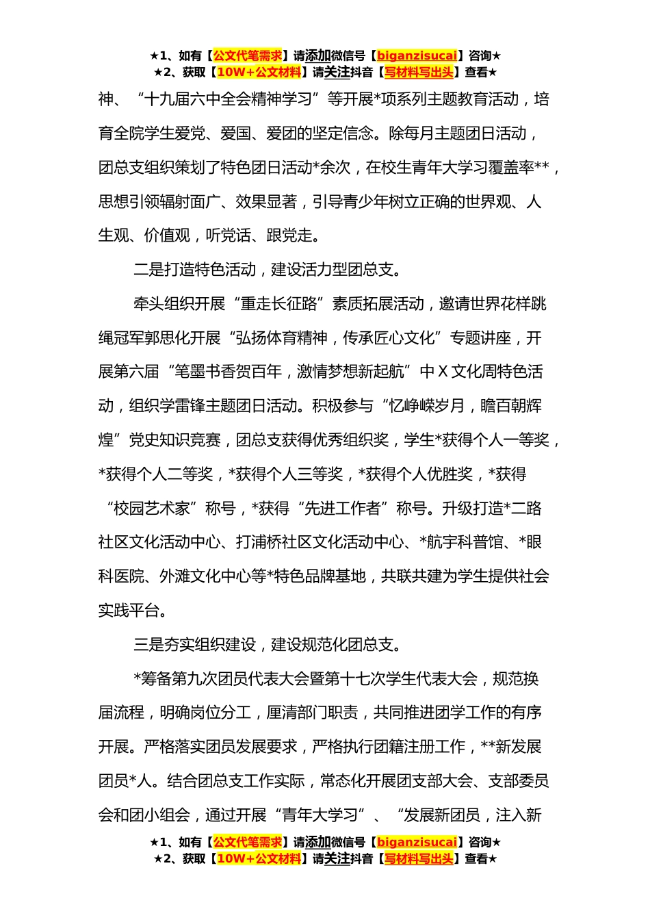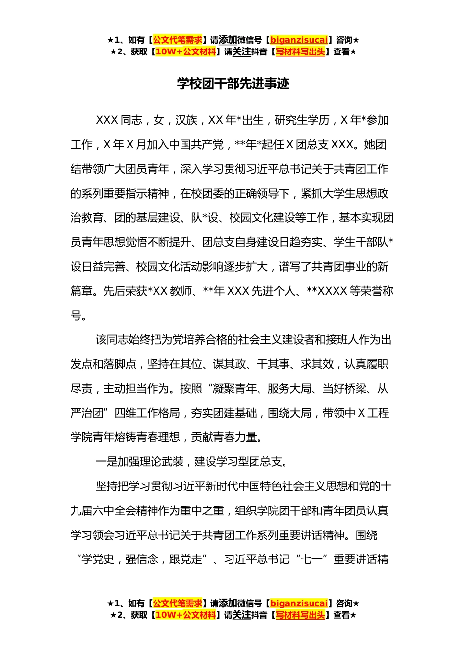 ★1、如有【公文代笔需求】请添加微信号【biganzisucai】咨询★★2、获取【10W+公文材料】请关注抖音【写材料写出头】查看★学校团干部先进事迹XXX同志,女,汉族,XX年*出生,研究生学历,X年*参加工作,X年X月加入中国共产党,**年*起任X团总支XXX。她团结带领广大团员青年,深入学习贯彻习近平总书记关于共青团工作的系列重要指示精神,在校团委的正确领导下,紧抓大学生思想政治教育、团的基层建设、队*设、校园文化建设等工作,基本实现团员青年思想觉悟不断提升、团总支自身建设日趋夯实、学生干部队*设日益完善、校园文化活动影响逐步扩大,谱写了共青团事业的新篇章。先后荣获*XX教师、**年XXX先进个人、**XXXX等荣誉称号。该同志始终把为党培养合格的社会主义建设者和接班人作为出发点和落脚点,坚持在其...