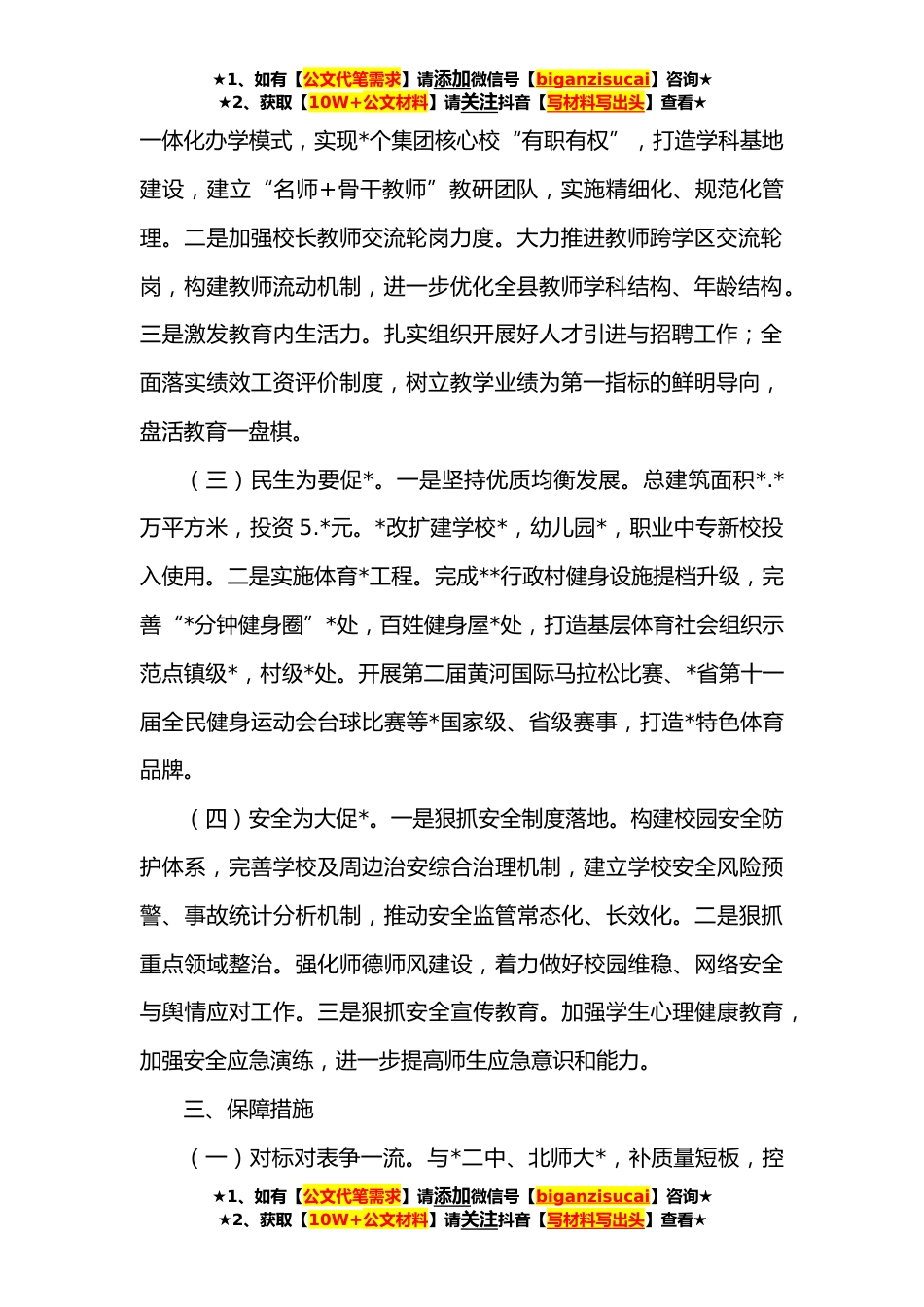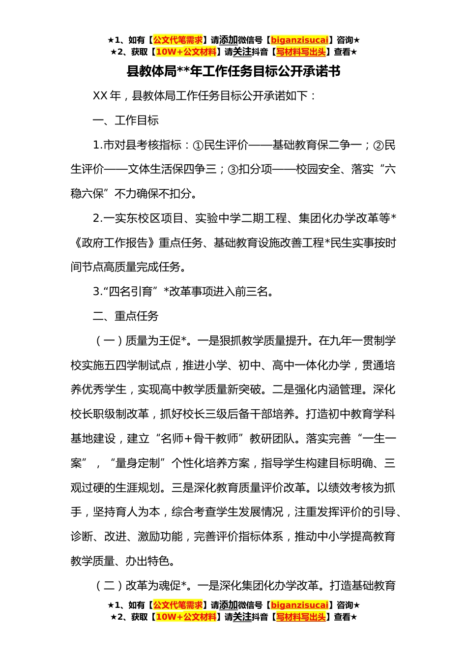★1、如有【公文代笔需求】请添加微信号【biganzisucai】咨询★★2、获取【10W+公文材料】请关注抖音【写材料写出头】查看★县教体局**年工作任务目标公开承诺书XX年,县教体局工作任务目标公开承诺如下:一、工作目标1.市对县考核指标:①民生评价——基础教育保二争一;②民生评价——文体生活保四争三;③扣分项——校园安全、落实“六稳六保”不力确保不扣分。2.一实东校区项目、实验中学二期工程、集团化办学改革等*《政府工作报告》重点任务、基础教育设施改善工程*民生实事按时间节点高质量完成任务。3.“四名引育”*改革事项进入前三名。二、重点任务(一)质量为王促*。一是狠抓教学质量提升。在九年一贯制学校实施五四学制试点,推进小学、初中、高中一体化办学,贯通培养优秀学生,实现高中教学质量新...