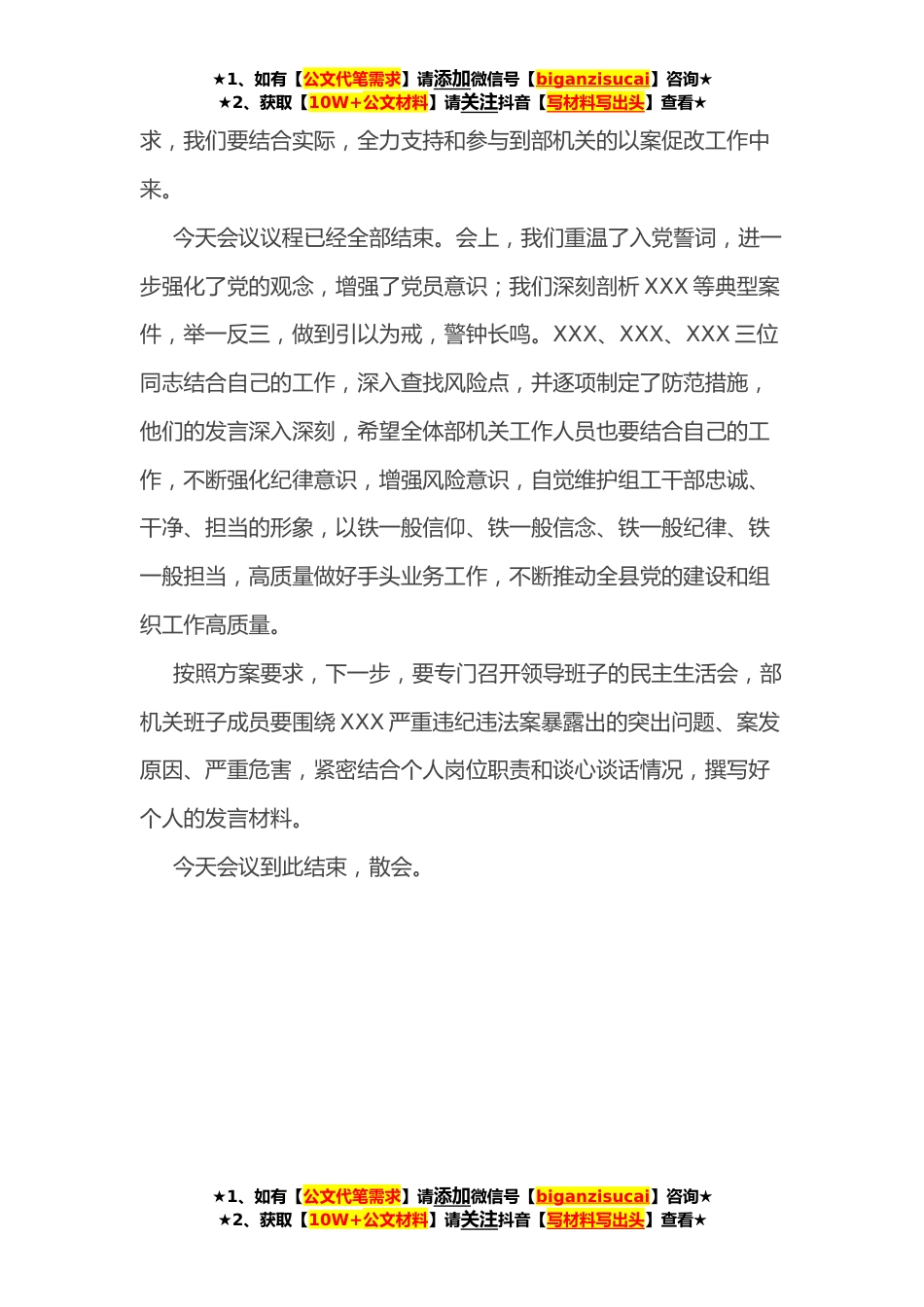 ★1、如有【公文代笔需求】请添加微信号【biganzisucai】咨询★★2、获取【10W+公文材料】请关注抖音【写材料写出头】查看★县直部委机关以案促改警示教育会主持词(通稿)同志们:按照县委以案促改工作要求,根据部机关以案促改安排,今天召开部机关以案促改警示教育会。这次会议的主要任务就是贯彻落实XX月XX日全县领导干部以案促改警示教育大会精神,从认真剖析XXX等典型案件中汲取教训,在重点领域防控、关键环节预防上下功夫,扎实做好宣传动员、剖析整改、完善制度、监督检查等各阶段工作,高质量推进部机关以案促改工作,确保防微杜渐、标本兼治,不断维护好XXX部门风清气正的模范形象。参加今天会议的是部机关全体同志。今天的会议共有六项议程,下面依次进行。会议进行第一项议程,重温入党誓词,请全体...