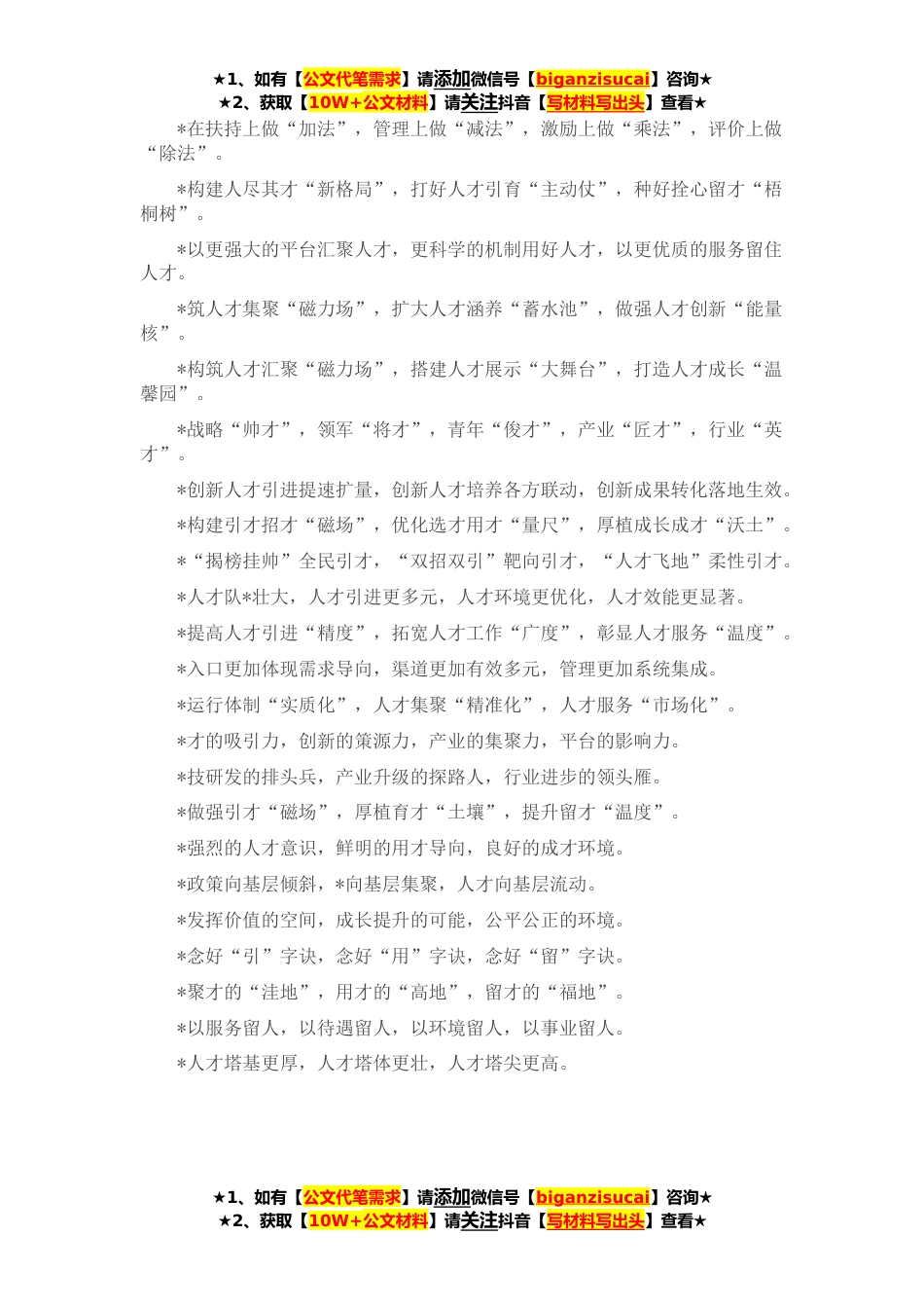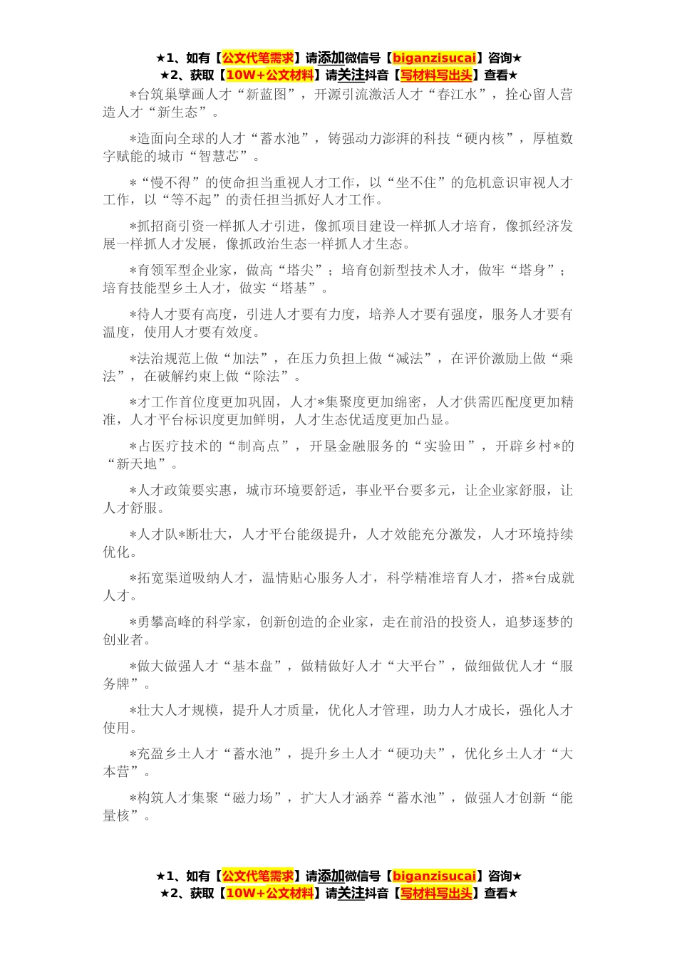 ★1、如有【公文代笔需求】请添加微信号【biganzisucai】咨询★★2、获取【10W+公文材料】请关注抖音【写材料写出头】查看★*台筑巢擘画人才“新蓝图”,开源引流激活人才“春江水”,拴心留人营造人才“新生态”。*造面向全球的人才“蓄水池”,铸强动力澎湃的科技“硬内核”,厚植数字赋能的城市“智慧芯”。*“慢不得”的使命担当重视人才工作,以“坐不住”的危机意识审视人才工作,以“等不起”的责任担当抓好人才工作。*抓招商引资一样抓人才引进,像抓项目建设一样抓人才培育,像抓经济发展一样抓人才发展,像抓政治生态一样抓人才生态。*育领军型企业家,做高“塔尖”;培育创新型技术人才,做牢“塔身”;培育技能型乡土人才,做实“塔基”。*待人才要有高度,引进人才要有力度,培养人才要有强度,服务...