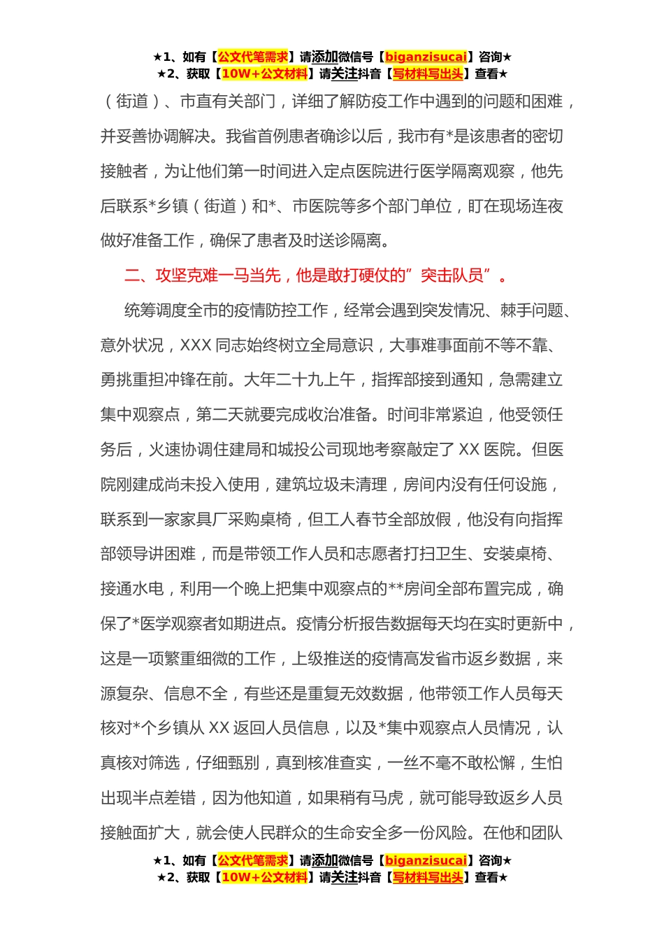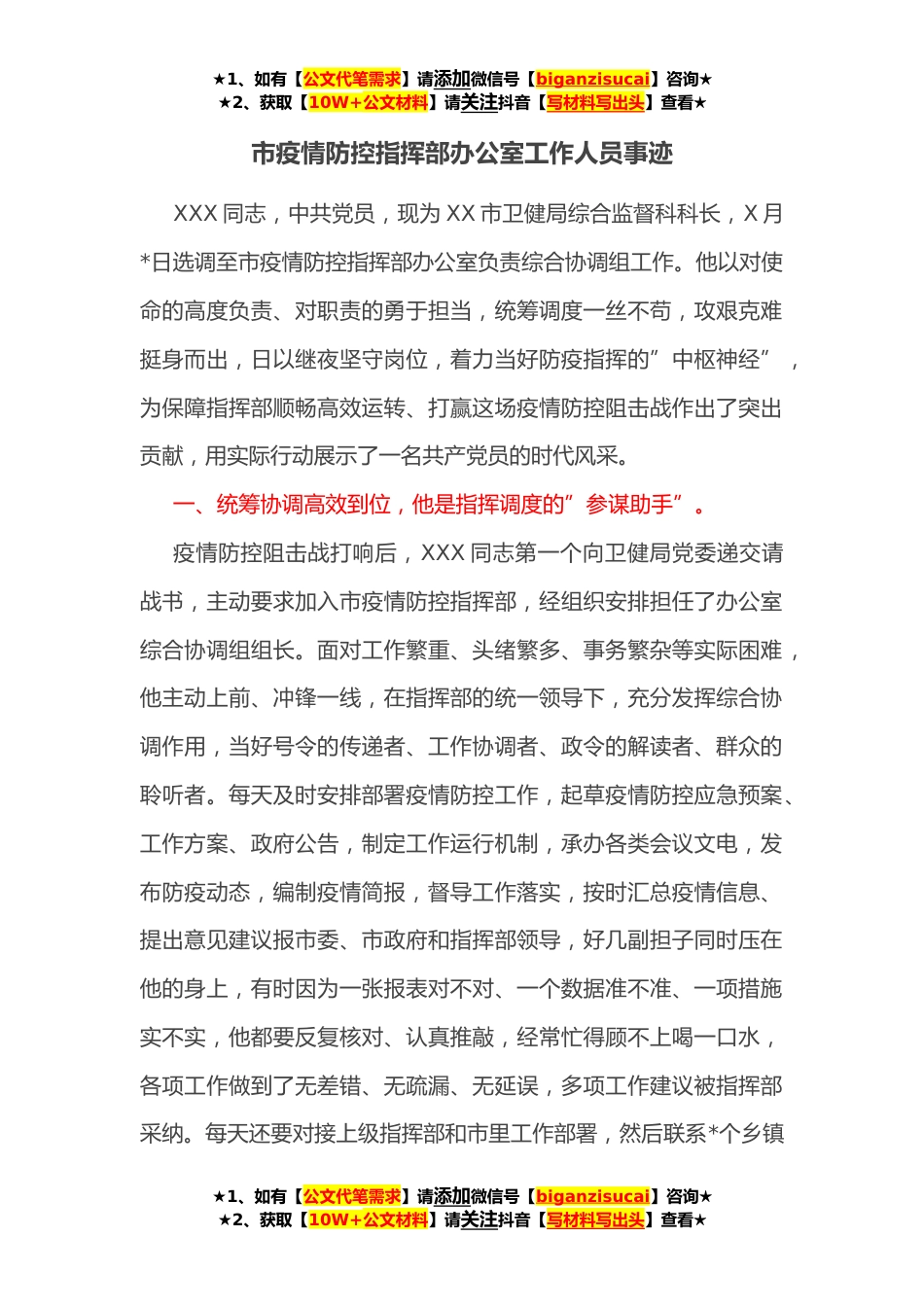 ★1、如有【公文代笔需求】请添加微信号【biganzisucai】咨询★★2、获取【10W+公文材料】请关注抖音【写材料写出头】查看★市疫情防控指挥部办公室工作人员事迹XXX同志,中共党员,现为XX市卫健局综合监督科科长,X月*日选调至市疫情防控指挥部办公室负责综合协调组工作。他以对使命的高度负责、对职责的勇于担当,统筹调度一丝不苟,攻艰克难挺身而出,日以继夜坚守岗位,着力当好防疫指挥的”中枢神经”,为保障指挥部顺畅高效运转、打赢这场疫情防控阻击战作出了突出贡献,用实际行动展示了一名共产党员的时代风采。一、统筹协调高效到位,他是指挥调度的”参谋助手”。疫情防控阻击战打响后,XXX同志第一个向卫健局党委递交请战书,主动要求加入市疫情防控指挥部,经组织安排担任了办公室综合协调组组长。面...
