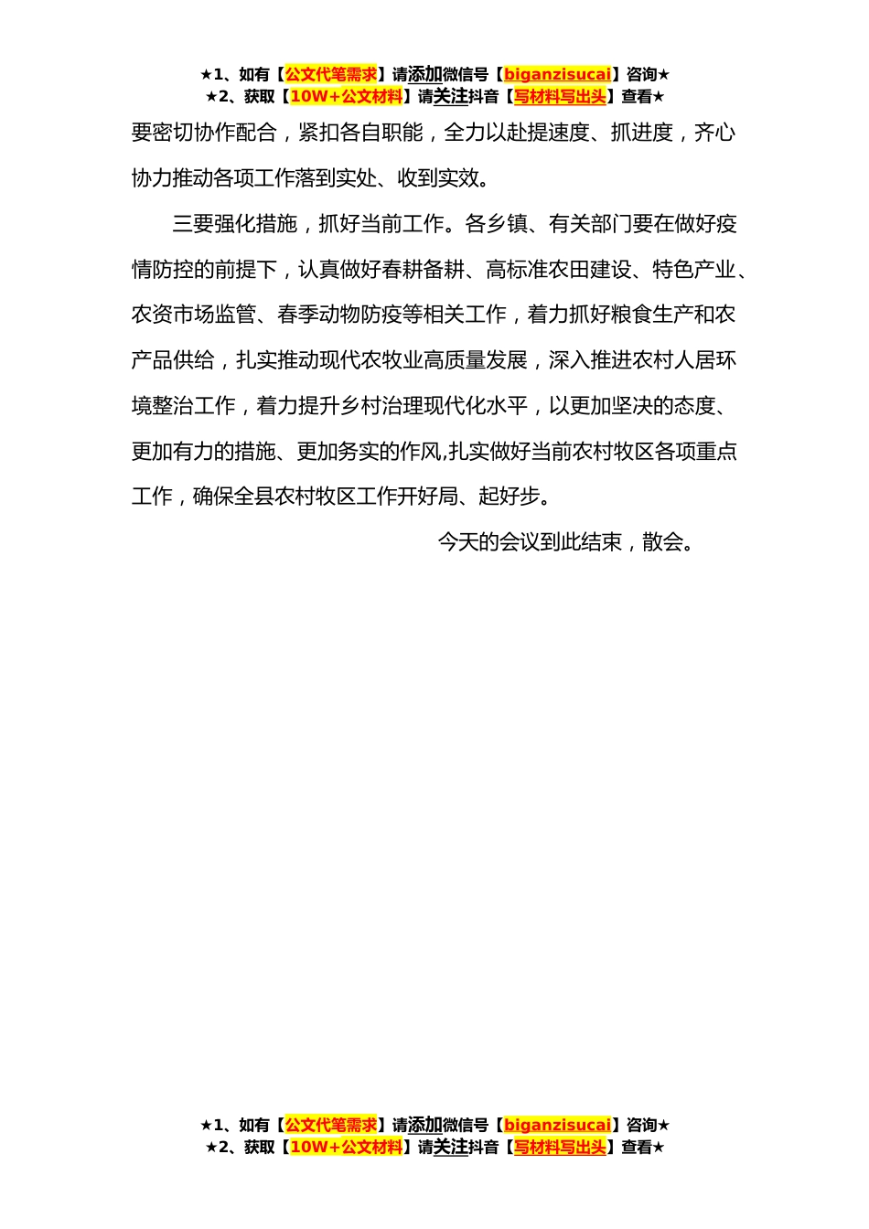 ★1、如有【公文代笔需求】请添加微信号【biganzisucai】咨询★★2、获取【10W+公文材料】请关注抖音【写材料写出头】查看★县委农村牧区暨乡村*工作会议主持词同志们:今年,是“三农”工作重心从脱贫攻坚取得胜利后向全面推进乡村*历史性转移的关键之年,持续巩固拓展脱贫攻坚成果同乡村*有效衔接的任务十分艰巨,持续保障农民稳定增收的任务十分紧迫,推进农业农村高质量发展的任务十分繁重。刚才,X书记、X县长对全县农村牧区和乡村*工作进行了安排部署,思想很深刻,概括很全面,既提出了明确要求,也寄予了殷切希望,具有很强的针对性和可操作性,同志们一定要认真学习,深刻领会,切实抓好贯彻落实。下面,就农村牧区、乡村*具体工作,我在强调几点意见。一要提高认识,形成思想共识。农村牧区工作事关全局...