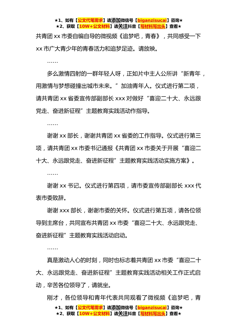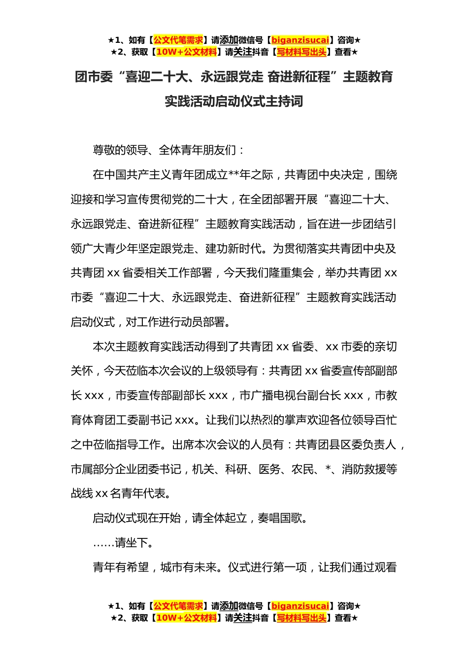 ★1、如有【公文代笔需求】请添加微信号【biganzisucai】咨询★★2、获取【10W+公文材料】请关注抖音【写材料写出头】查看★团市委“喜迎二十大、永远跟党走奋进新征程”主题教育实践活动启动仪式主持词尊敬的领导、全体青年朋友们:在中国共产主义青年团成立**年之际,共青团中央决定,围绕迎接和学习宣传贯彻党的二十大,在全团部署开展“喜迎二十大、永远跟党走、奋进新征程”主题教育实践活动,旨在进一步团结引领广大青少年坚定跟党走、建功新时代。为贯彻落实共青团中央及共青团xx省委相关工作部署,今天我们隆重集会,举办共青团xx市委“喜迎二十大、永远跟党走、奋进新征程”主题教育实践活动启动仪式,对工作进行动员部署。本次主题教育实践活动得到了共青团xx省委、xx市委的亲切关怀,今天莅临本次会议...