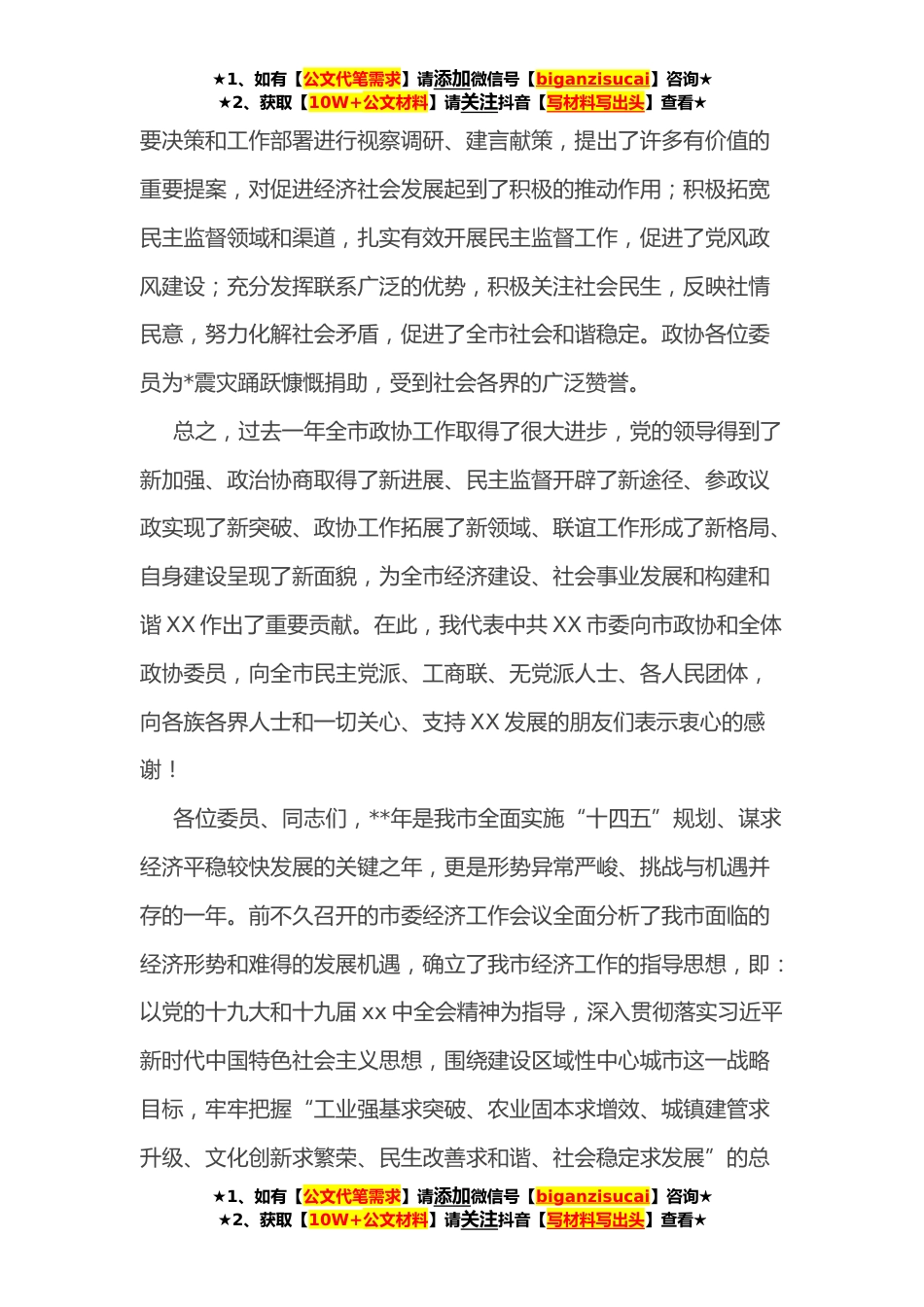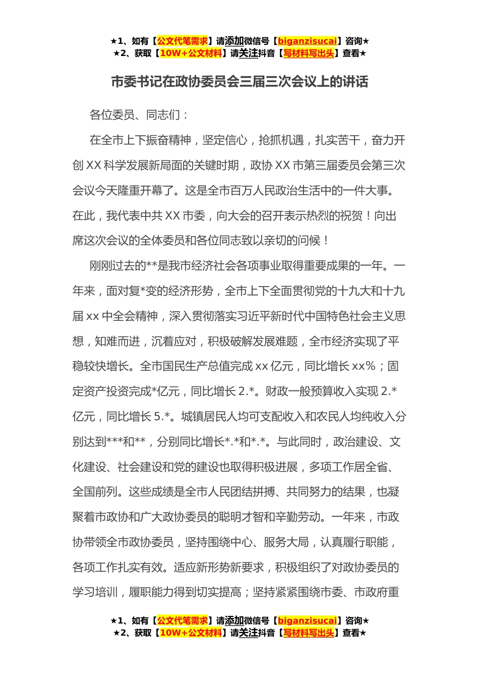★1、如有【公文代笔需求】请添加微信号【biganzisucai】咨询★★2、获取【10W+公文材料】请关注抖音【写材料写出头】查看★市委书记在政协委员会三届三次会议上的讲话各位委员、同志们:在全市上下振奋精神,坚定信心,抢抓机遇,扎实苦干,奋力开创XX科学发展新局面的关键时期,政协XX市第三届委员会第三次会议今天隆重开幕了。这是全市百万人民政治生活中的一件大事。在此,我代表中共XX市委,向大会的召开表示热烈的祝贺!向出席这次会议的全体委员和各位同志致以亲切的问候!刚刚过去的**是我市经济社会各项事业取得重要成果的一年。一年来,面对复*变的经济形势,全市上下全面贯彻党的十九大和十九届xx中全会精神,深入贯彻落实习近平新时代中国特色社会主义思想,知难而进,沉着应对,积极破解发展难题,全...