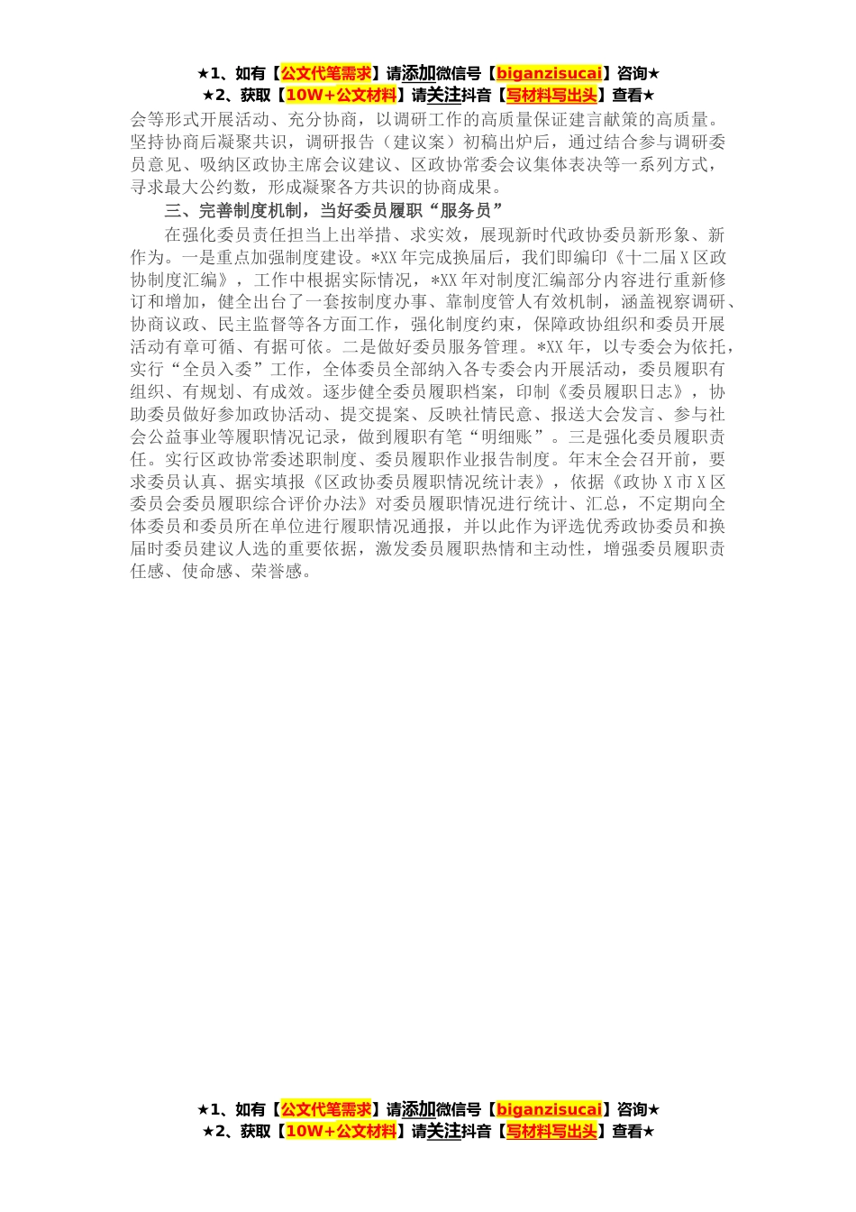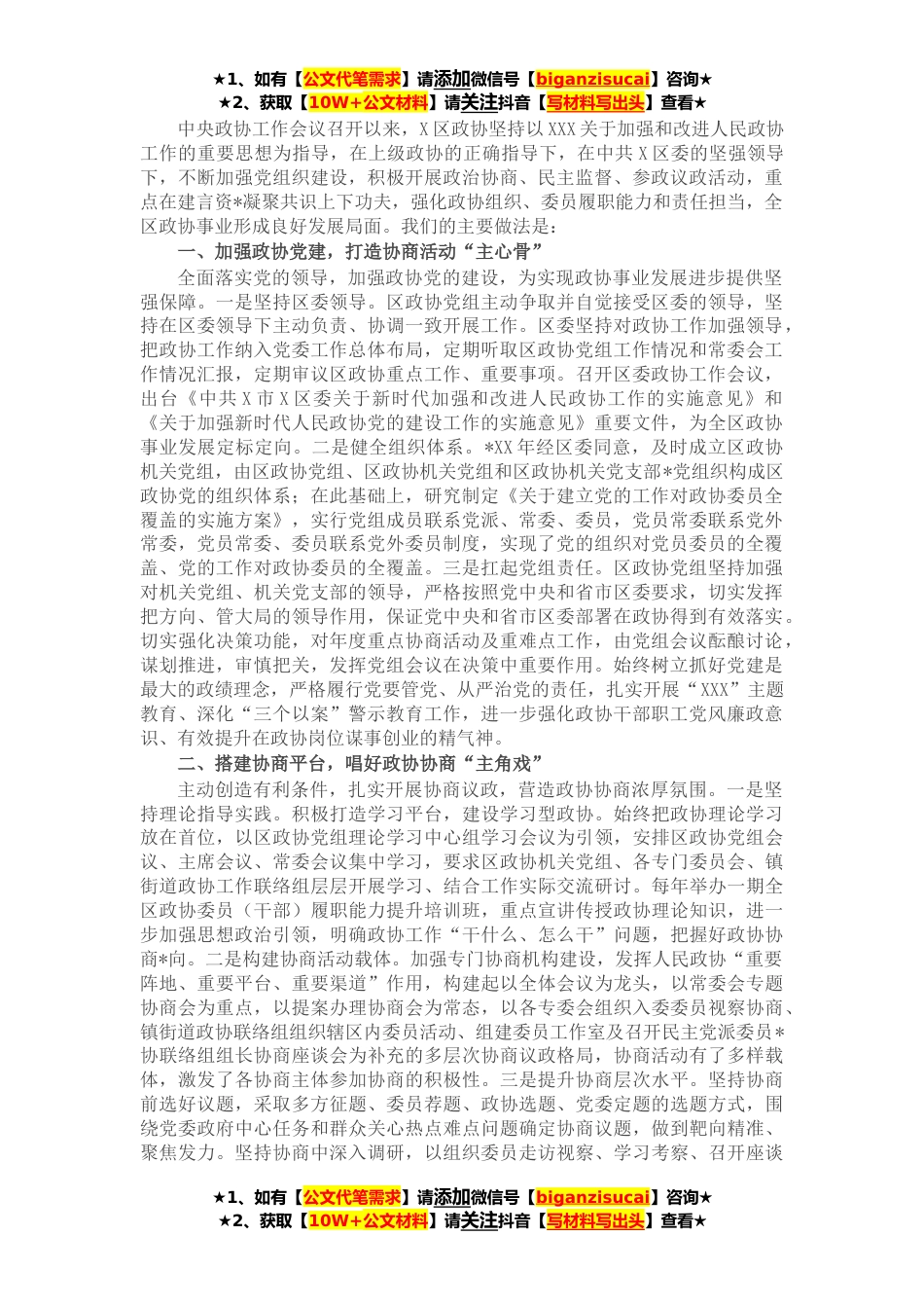 ★1、如有【公文代笔需求】请添加微信号【biganzisucai】咨询★★2、获取【10W+公文材料】请关注抖音【写材料写出头】查看★中央政协工作会议召开以来,X区政协坚持以XXX关于加强和改进人民政协工作的重要思想为指导,在上级政协的正确指导下,在中共X区委的坚强领导下,不断加强党组织建设,积极开展政治协商、民主监督、参政议政活动,重点在建言资*凝聚共识上下功夫,强化政协组织、委员履职能力和责任担当,全区政协事业形成良好发展局面。我们的主要做法是:一、加强政协党建,打造协商活动“主心骨”全面落实党的领导,加强政协党的建设,为实现政协事业发展进步提供坚强保障。一是坚持区委领导。区政协党组主动争取并自觉接受区委的领导,坚持在区委领导下主动负责、协调一致开展工作。区委坚持对政协工作...