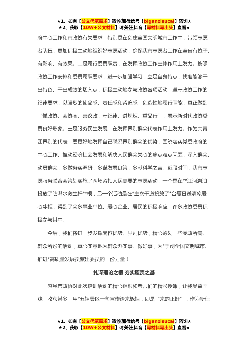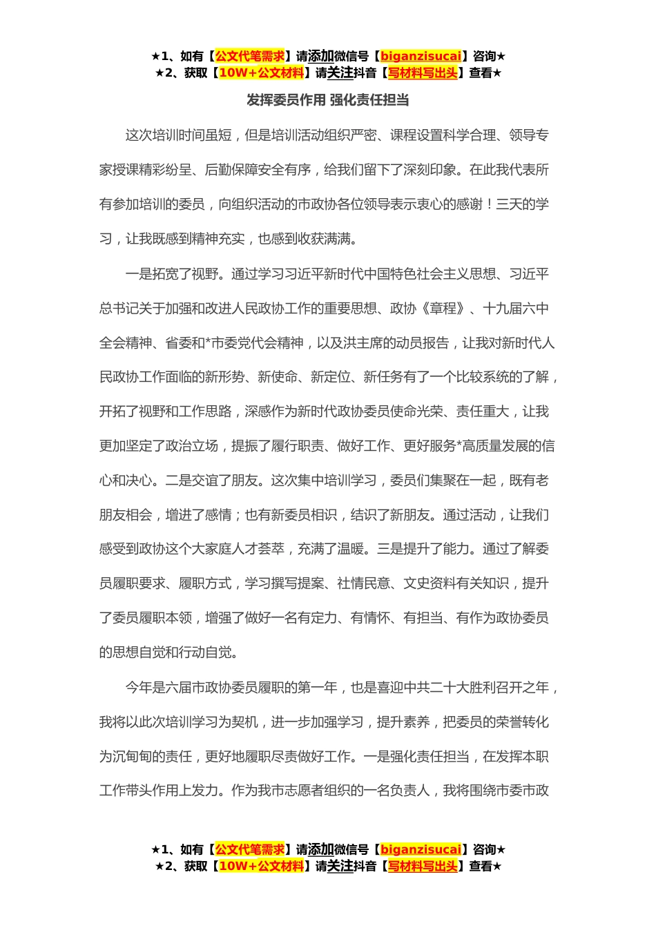 ★1、如有【公文代笔需求】请添加微信号【biganzisucai】咨询★★2、获取【10W+公文材料】请关注抖音【写材料写出头】查看★发挥委员作用强化责任担当这次培训时间虽短,但是培训活动组织严密、课程设置科学合理、领导专家授课精彩纷呈、后勤保障安全有序,给我们留下了深刻印象。在此我代表所有参加培训的委员,向组织活动的市政协各位领导表示衷心的感谢!三天的学习,让我既感到精神充实,也感到收获满满。一是拓宽了视野。通过学习习近平新时代中国特色社会主义思想、习近平总书记关于加强和改进人民政协工作的重要思想、政协《章程》、十九届六中全会精神、省委和*市委党代会精神,以及洪主席的动员报告,让我对新时代人民政协工作面临的新形势、新使命、新定位、新任务有了一个比较系统的了解,开拓了视野和...