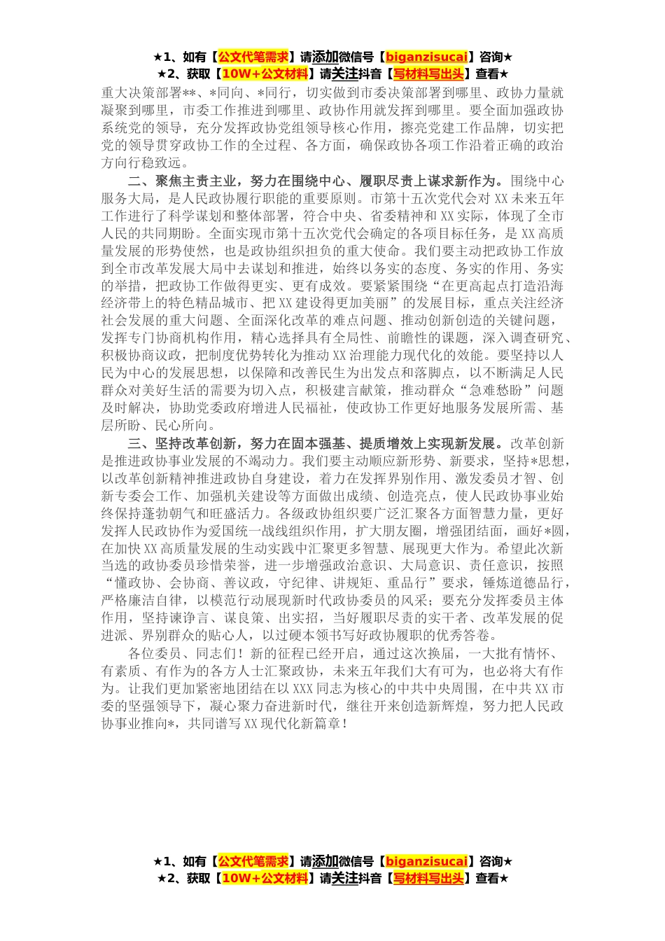 ★1、如有【公文代笔需求】请添加微信号【biganzisucai】咨询★★2、获取【10W+公文材料】请关注抖音【写材料写出头】查看★各位委员、同志们:中国人民政治协商会议第十三届XX市委员会第一次会议,在省委的高度重视下,在市委的正确领导下,在各有关方面大力支持下,经过全体委员共同努力,圆满完成各项议程,就要胜利闭幕了。这次会议是在全市上下深入学习贯彻市第十五次党代会精神、乘势而上全面推进社会主义现代化建设新征程的关键时期召开的。XXX书记、XXX市长等领导同志出席大会开幕式和闭幕式,参加分组讨论,听取委员意见,共商XX发展大计,展现了人民政协协商民主的生机与活力。XXX书记代表中共XX市委在开幕式上作了讲话,对全市各级政协组织和广大政协委员的工作给予充分肯定,对做好新时代人民政协工作...