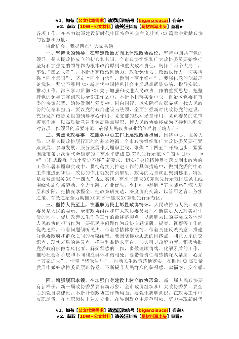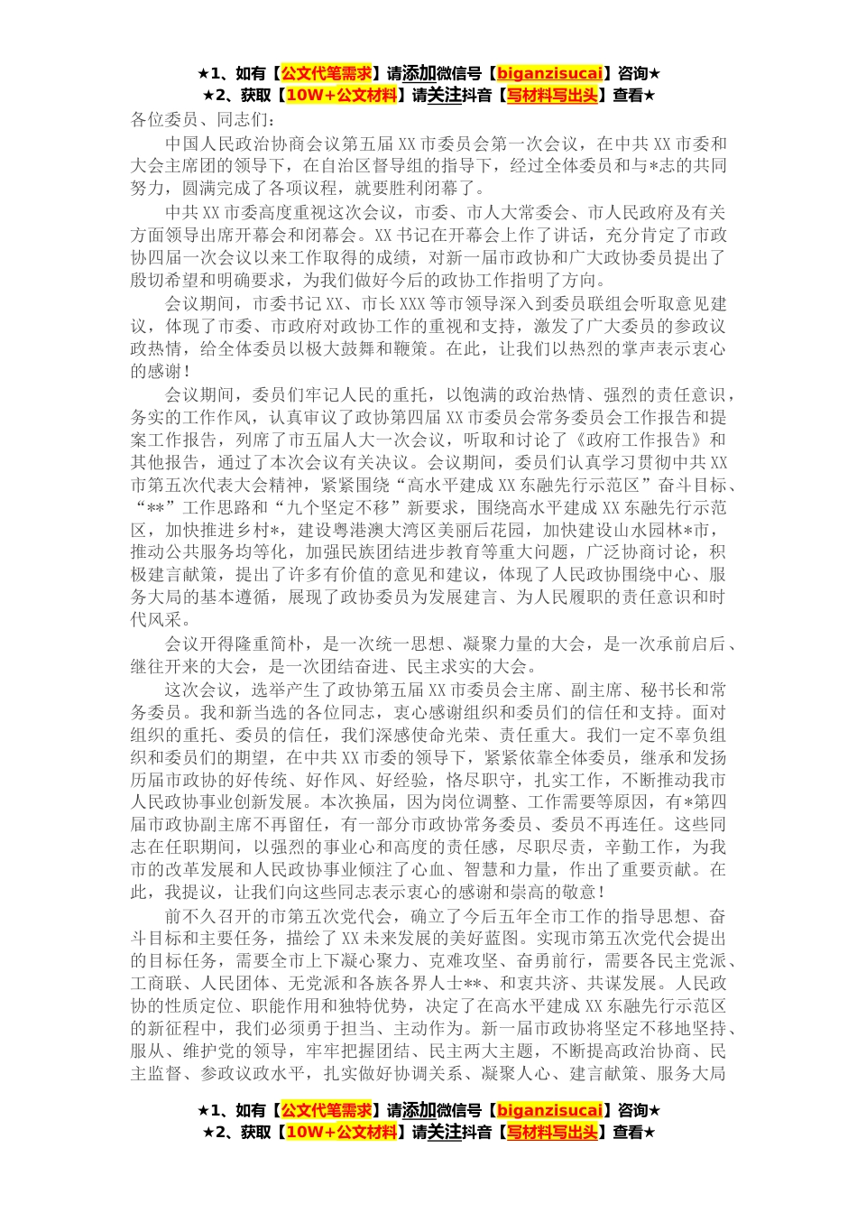 ★1、如有【公文代笔需求】请添加微信号【biganzisucai】咨询★★2、获取【10W+公文材料】请关注抖音【写材料写出头】查看★各位委员、同志们:中国人民政治协商会议第五届XX市委员会第一次会议,在中共XX市委和大会主席团的领导下,在自治区督导组的指导下,经过全体委员和与*志的共同努力,圆满完成了各项议程,就要胜利闭幕了。中共XX市委高度重视这次会议,市委、市人大常委会、市人民政府及有关方面领导出席开幕会和闭幕会。XX书记在开幕会上作了讲话,充分肯定了市政协四届一次会议以来工作取得的成绩,对新一届市政协和广大政协委员提出了殷切希望和明确要求,为我们做好今后的政协工作指明了方向。会议期间,市委书记XX、市长XXX等市领导深入到委员联组会听取意见建议,体现了市委、市政府对政协工作的重...