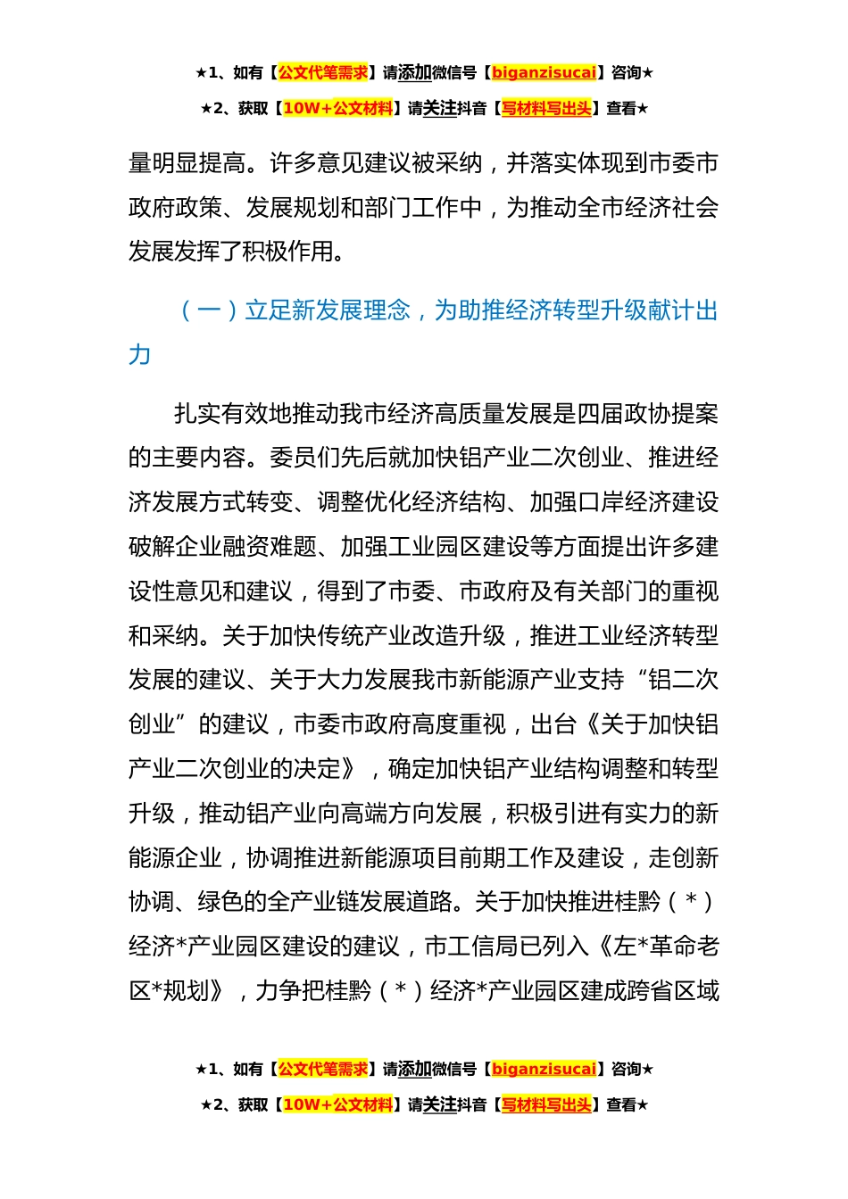 ★1、如有【公文代笔需求】请添加微信号【biganzisucai】咨询★★2、获取【10W+公文材料】请关注抖音【写材料写出头】查看★在政协第X届市委员会第X次会议上提案工作情况的报告各位委员:我受中国人民政治协商会议第X届XX市委员会常务委员会的委托,向大会报告五年来的提案工作情况,请予审议。一、基本情况市政协四届一次会议以来,广大政协委员、政协各参加单位和各专门委员会,坚持以习近平新时代中国特色社会主义思想为指导,认真学习贯彻党的十九大和十九届二中、三中、四中、五中全会精神,紧紧围绕市委、市政府中心工作,聚焦全市经济社会发展和人民群众普遍关心的实际问题,以高度的政治责任感和使命感,认真履行职责积极通过提案履职建言。五年来,委员共提出提案**件,经审查,立案**,立案率为*.*。其...