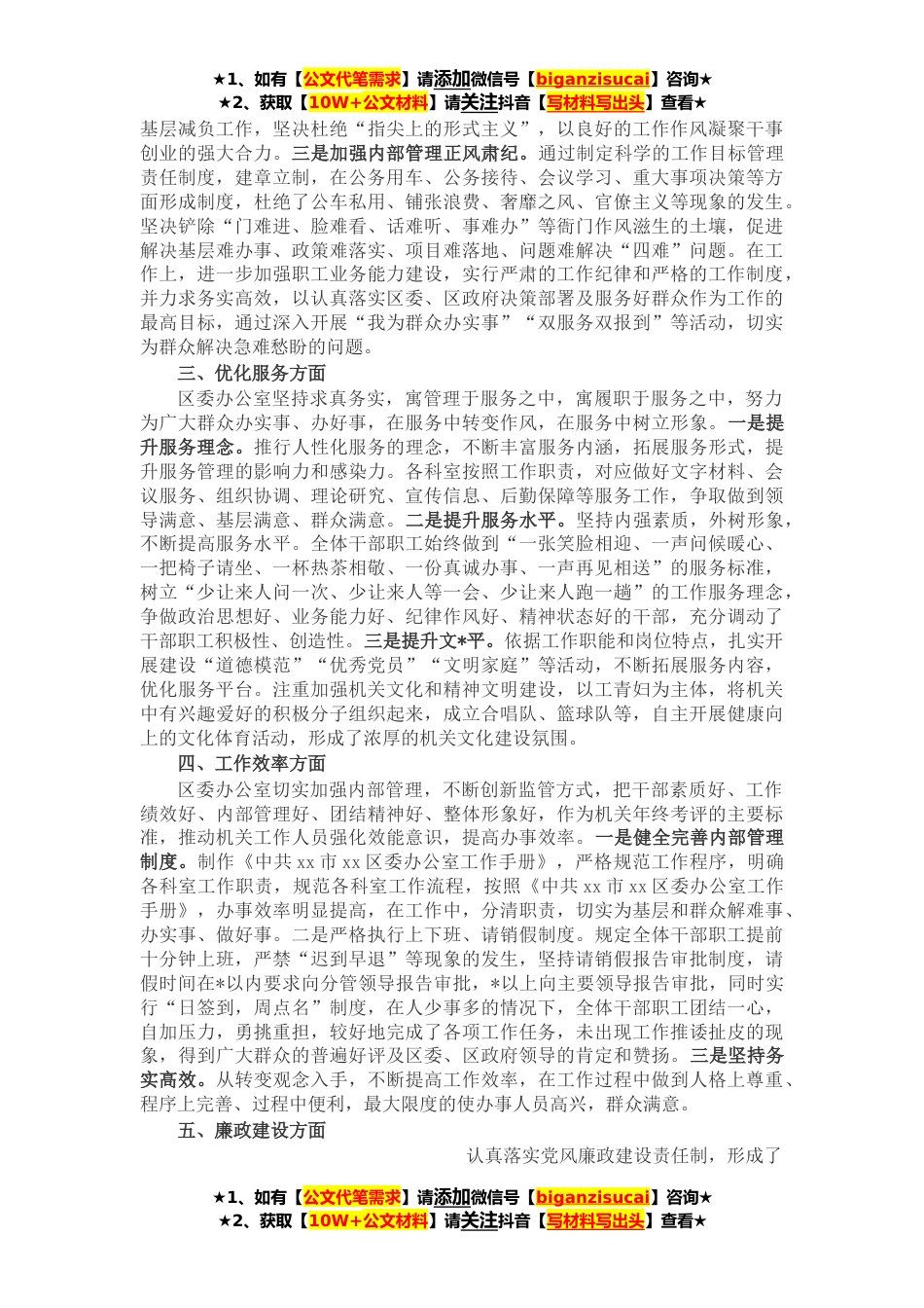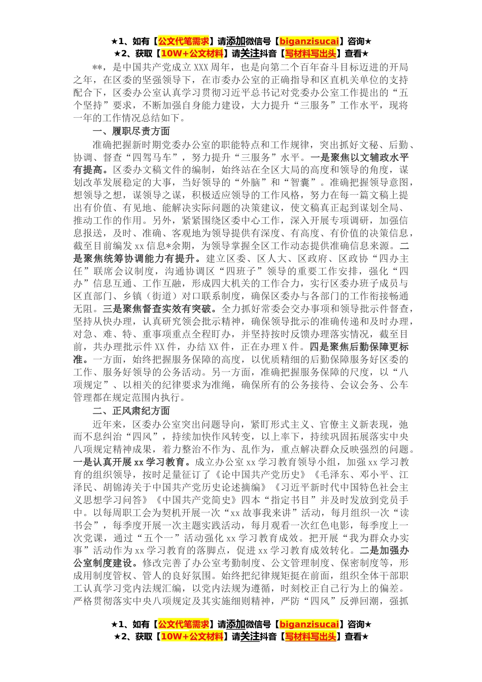 ★1、如有【公文代笔需求】请添加微信号【biganzisucai】咨询★★2、获取【10W+公文材料】请关注抖音【写材料写出头】查看★**,是中国共产党成立XXX周年,也是向第二个百年奋斗目标迈进的开局之年,在区委的坚强领导下,在市委办公室的正确指导和区直机关单位的支持配合下,区委办公室认真学习贯彻习近平总书记对党委办公室工作提出的“五个坚持”要求,不断加强自身能力建设,大力提升“三服务”工作水平,现将一年的工作情况总结如下。一、履职尽责方面准确把握新时期党委办公室的职能特点和工作规律,突出抓好文秘、后勤、协调、督查“四驾马车”,努力提升“三服务”水平。一是聚焦以文辅政水平有提高。区委办文稿文件的编制,始终站在全区大局的高度和领导的角度,谋划改革发展稳定的大事,当好领导的“外脑...