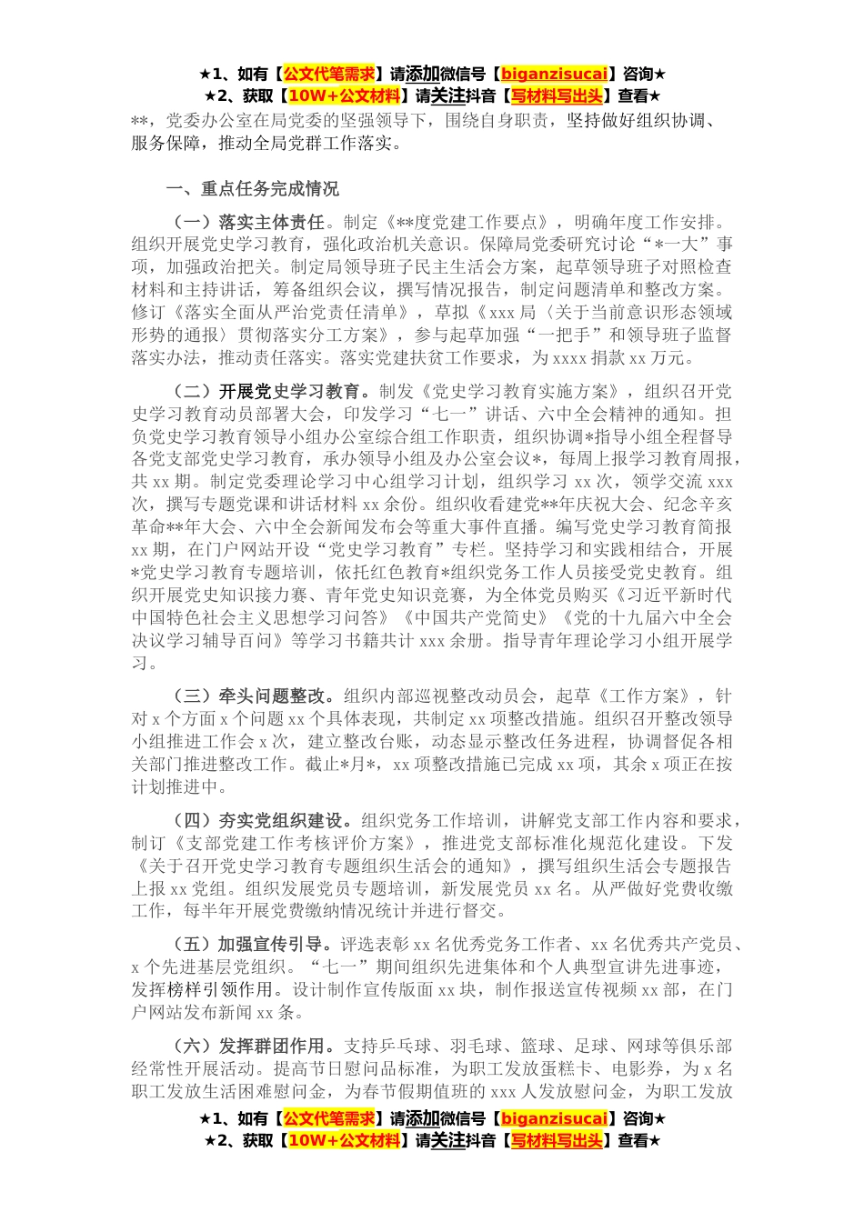 ★1、如有【公文代笔需求】请添加微信号【biganzisucai】咨询★★2、获取【10W+公文材料】请关注抖音【写材料写出头】查看★**,党委办公室在局党委的坚强领导下,围绕自身职责,坚持做好组织协调、服务保障,推动全局党群工作落实。一、重点任务完成情况(一)落实主体责任。制定《**度党建工作要点》,明确年度工作安排。组织开展党史学习教育,强化政治机关意识。保障局党委研究讨论“*一大”事项,加强政治把关。制定局领导班子民主生活会方案,起草领导班子对照检查材料和主持讲话,筹备组织会议,撰写情况报告,制定问题清单和整改方案。修订《落实全面从严治党责任清单》,草拟《xxx局〈关于当前意识形态领域形势的通报〉贯彻落实分工方案》,参与起草加强“一把手”和领导班子监督落实办法,推动责任落实...