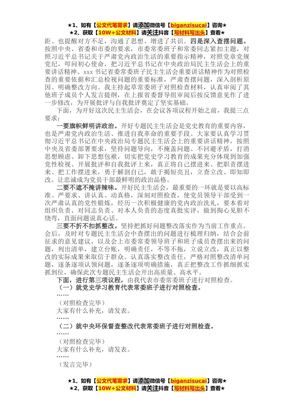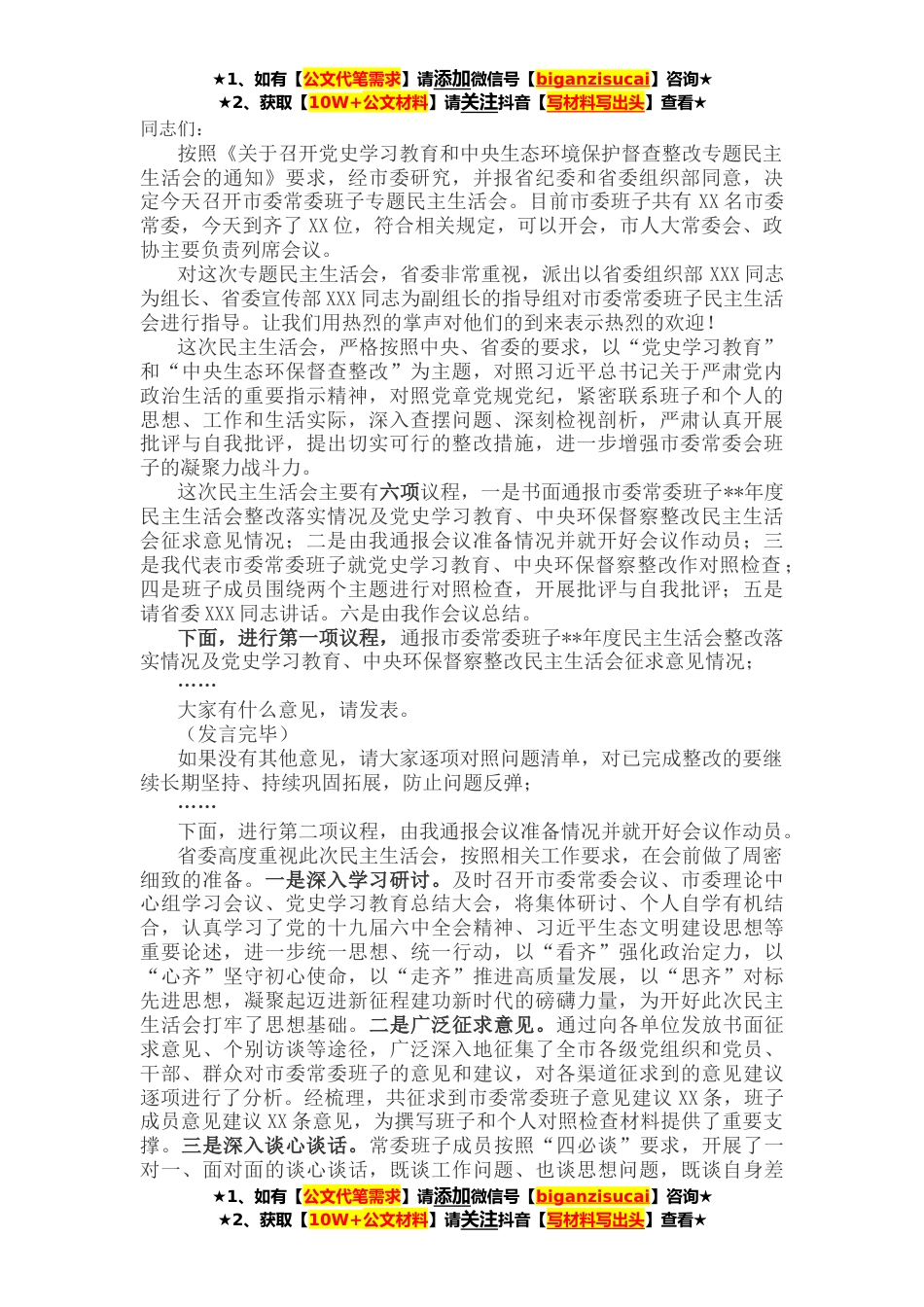 ★1、如有【公文代笔需求】请添加微信号【biganzisucai】咨询★★2、获取【10W+公文材料】请关注抖音【写材料写出头】查看★同志们:按照《关于召开党史学习教育和中央生态环境保护督查整改专题民主生活会的通知》要求,经市委研究,并报省纪委和省委组织部同意,决定今天召开市委常委班子专题民主生活会。目前市委班子共有XX名市委常委,今天到齐了XX位,符合相关规定,可以开会,市人大常委会、政协主要负责列席会议。对这次专题民主生活会,省委非常重视,派出以省委组织部XXX同志为组长、省委宣传部XXX同志为副组长的指导组对市委常委班子民主生活会进行指导。让我们用热烈的掌声对他们的到来表示热烈的欢迎!这次民主生活会,严格按照中央、省委的要求,以“党史学习教育”和“中央生态环保督查整改”为主题...