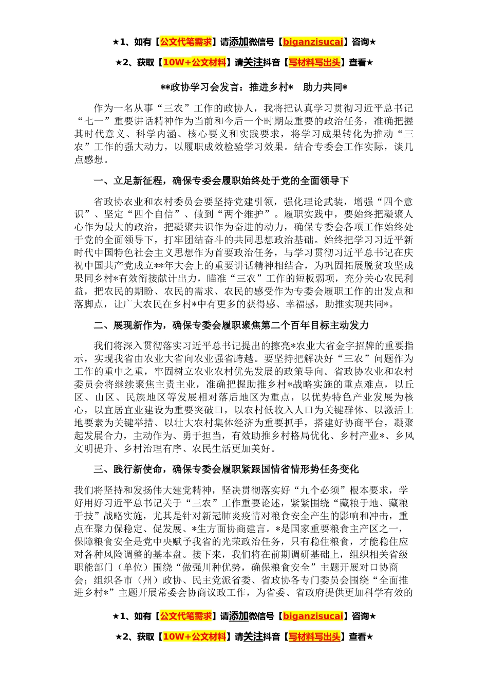 ★1、如有【公文代笔需求】请添加微信号【biganzisucai】咨询★★2、获取【10W+公文材料】请关注抖音【写材料写出头】查看★**政协学习会发言:推进乡村*助力共同*作为一名从事“三农”工作的政协人,我将把认真学习贯彻习近平总书记“七一”重要讲话精神作为当前和今后一个时期最重要的政治任务,准确把握其时代意义、科学内涵、核心要义和实践要求,将学习成果转化为推动“三农”工作的强大动力,以履职成效检验学习效果。结合专委会工作实际,谈几点感想。一、立足新征程,确保专委会履职始终处于党的全面领导下省政协农业和农村委员会要坚持党建引领,强化理论武装,增强“四个意识”、坚定“四个自信”、做到“两个维护”。履职实践中,要始终把凝聚人心作为最大的政治,把凝聚共识作为奋进的动力,确保专委...