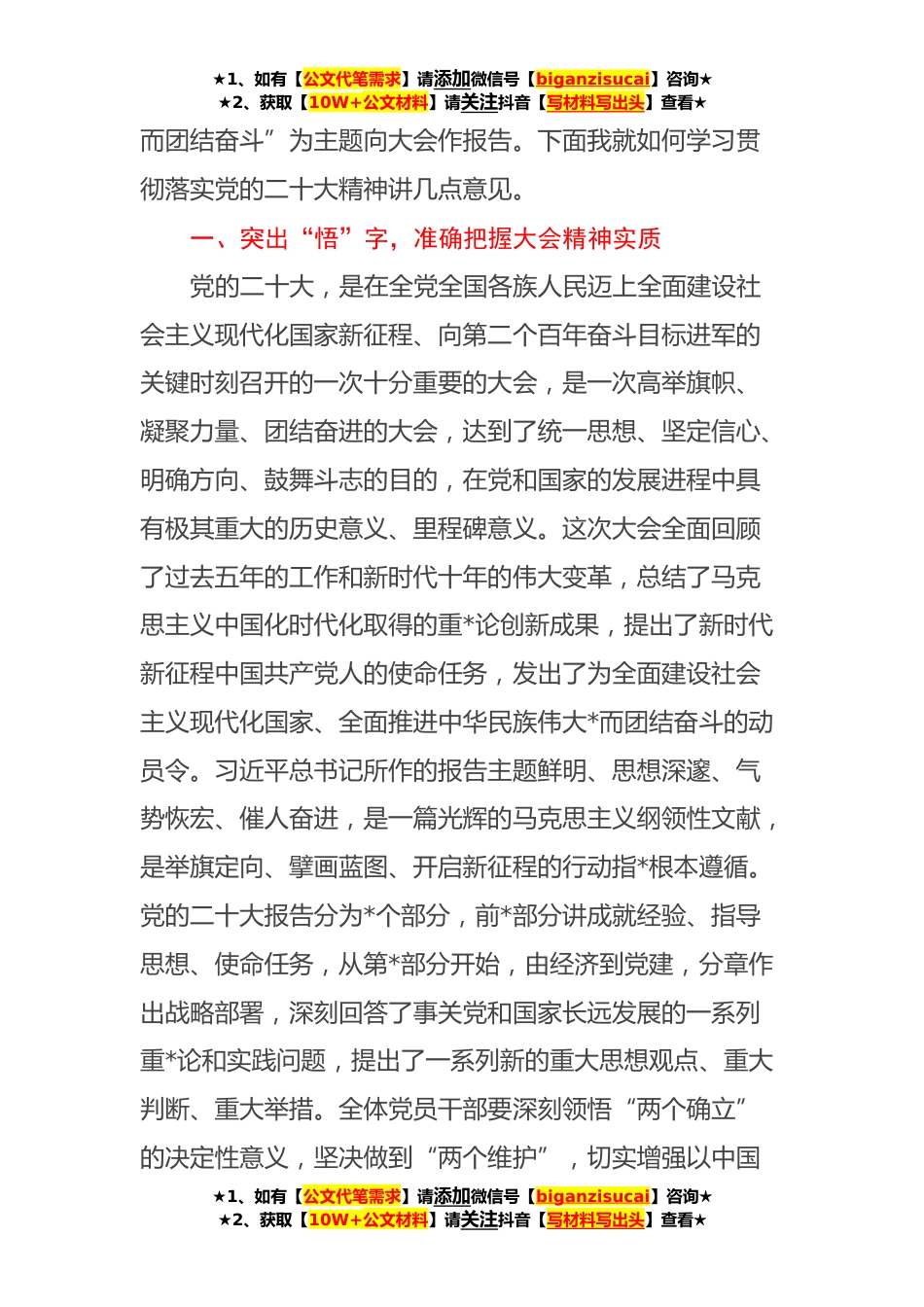 ★1、如有【公文代笔需求】请添加微信号【biganzisucai】咨询★★2、获取【10W+公文材料】请关注抖音【写材料写出头】查看★传达学习二十大精神的主持词及讲话同志们:今天,我们举行××干部大会,专题学习党的二十大精神,特别是习近平总书记代表第十九届中央委员会作的党的二十大作报告。本次会议参会人员:××。今天的会议共三项议程第一项议程:由××领学党的二十大报告主要精神和中央纪委工作报告主要精神;······第二项议程:由××领学党章修正案主要精神、习近平总书记参加*代表团讨论时和在党的二十大闭幕大会上的重要讲话精神······第三项议程:由我作总结讲话。*月*日,我们一起观看了党的二十大开幕盛况,共同聆听了大会报告,今天再次学习,仍然能够感受到报告内容高屋建瓴、恢宏致远...