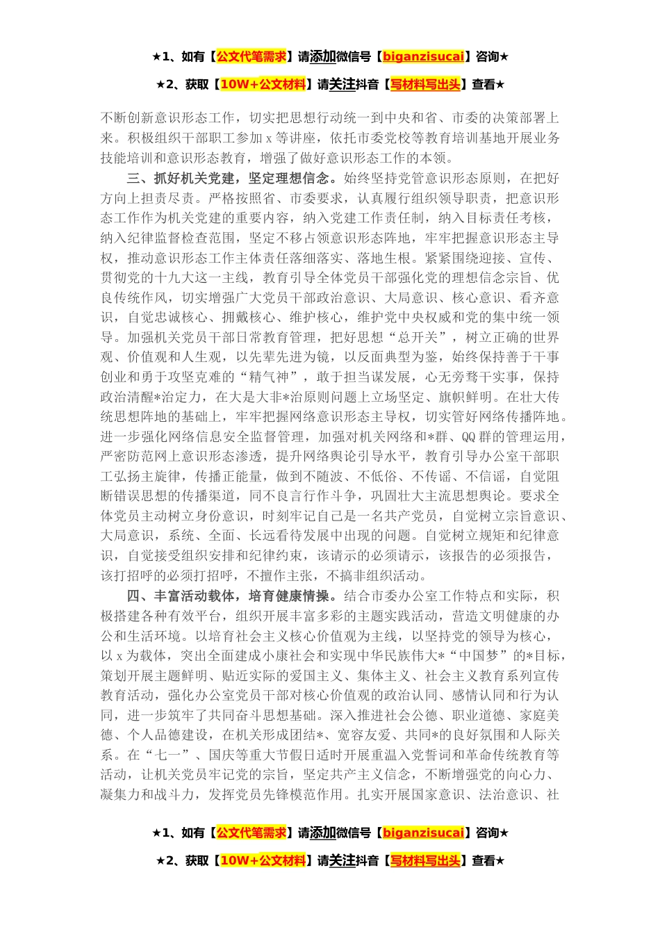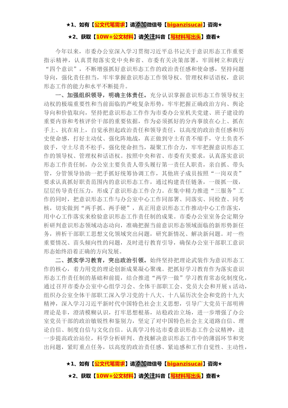 ★1、如有【公文代笔需求】请添加微信号【biganzisucai】咨询★★2、获取【10W+公文材料】请关注抖音【写材料写出头】查看★今年以来,市委办公室深入学习贯彻习近平总书记关于意识形态工作重要指示精神,认真贯彻落实党中央和省、市委有关决策部署,牢固树立和践行“四个意识”,不断增强抓好意识形态工作的政治责任感和使命感,坚持问题导向,强化责任担当,牢牢掌握意识形态工作领导权、管理权和话语权,意识形态工作的能力和水平不断提升。一、加强组织领导,明确主体责任。充分认识掌握意识形态工作领导权主动权的极端重要性和当前面临的严峻复杂形势,牢牢把握正确政治方向、舆论导向和价值取向,坚持把意识形态工作作为市委办公室机关党建、班子建设的重要内容和考核评价干部的重要依据,作为必须抓好的分...