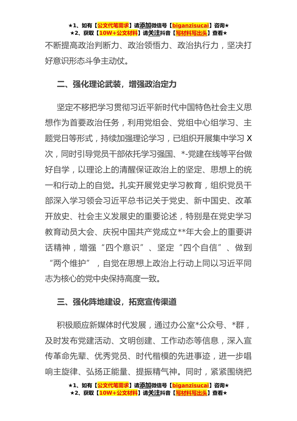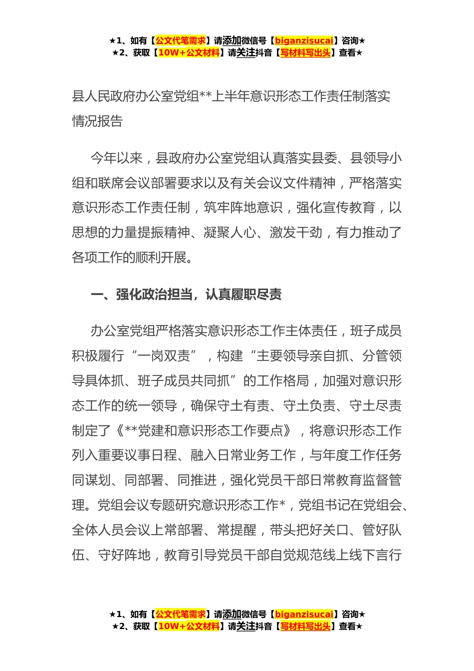 ★1、如有【公文代笔需求】请添加微信号【biganzisucai】咨询★★2、获取【10W+公文材料】请关注抖音【写材料写出头】查看★县人民政府办公室党组**上半年意识形态工作责任制落实情况报告今年以来,县政府办公室党组认真落实县委、县领导小组和联席会议部署要求以及有关会议文件精神,严格落实意识形态工作责任制,筑牢阵地意识,强化宣传教育,以思想的力量提振精神、凝聚人心、激发干劲,有力推动了各项工作的顺利开展。一、强化政治担当,认真履职尽责办公室党组严格落实意识形态工作主体责任,班子成员积极履行“一岗双责”,构建“主要领导亲自抓、分管领导具体抓、班子成员共同抓”的工作格局,加强对意识形态工作的统一领导,确保守土有责、守土负责、守土尽责制定了《**党建和意识形态工作要点》,将意识...