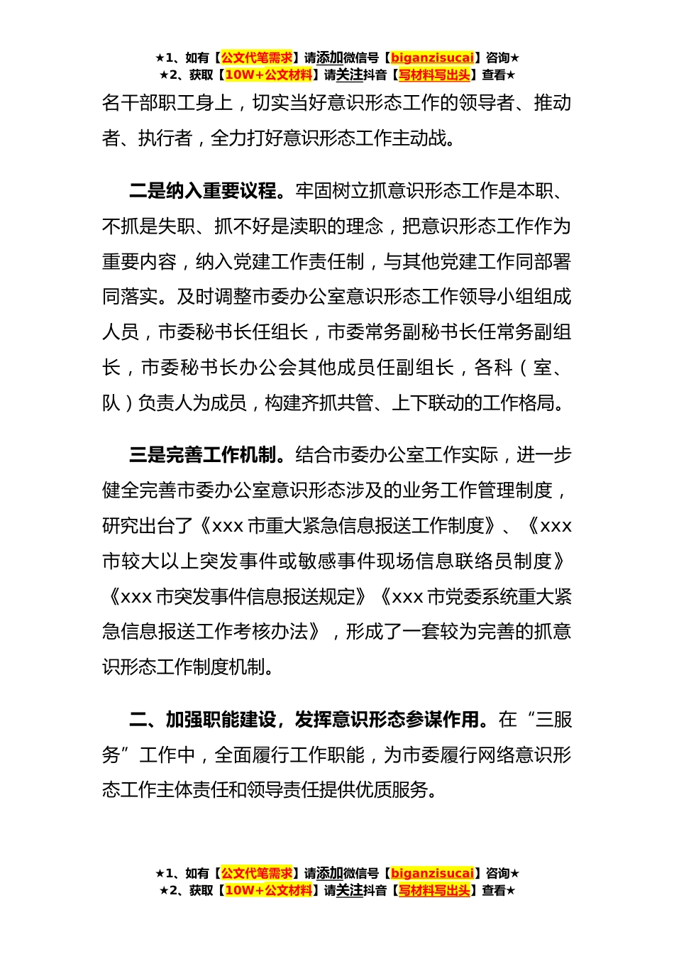 ★1、如有【公文代笔需求】请添加微信号【biganzisucai】咨询★★2、获取【10W+公文材料】请关注抖音【写材料写出头】查看★开展意识形态工作情况报告(市委办公室)今年以来,市委办公室以深入学习贯彻习近平新时代中国特色社会主义思想和党的十九大精神为首要政治任务,以党的政治建设为统领,以落实全面从严治党要求为主线认真贯彻落实中央和省、市委意识形态工作责任制,坚持党管意识形态不动摇,牢牢把握意识形态工作主导权。主要做到了“四个加强”。一、加强党的领导,健全意识形态工作责任体系。市委办公室高度重视意识形态工作,及时传达中央和省、市委关于意识形态工作的重大决策部署,认真学习领会有关文件精神,把主体责任放在心上、扛在肩上、抓在手上,强化履职自觉和使命担当,严守政治纪律*治规矩...