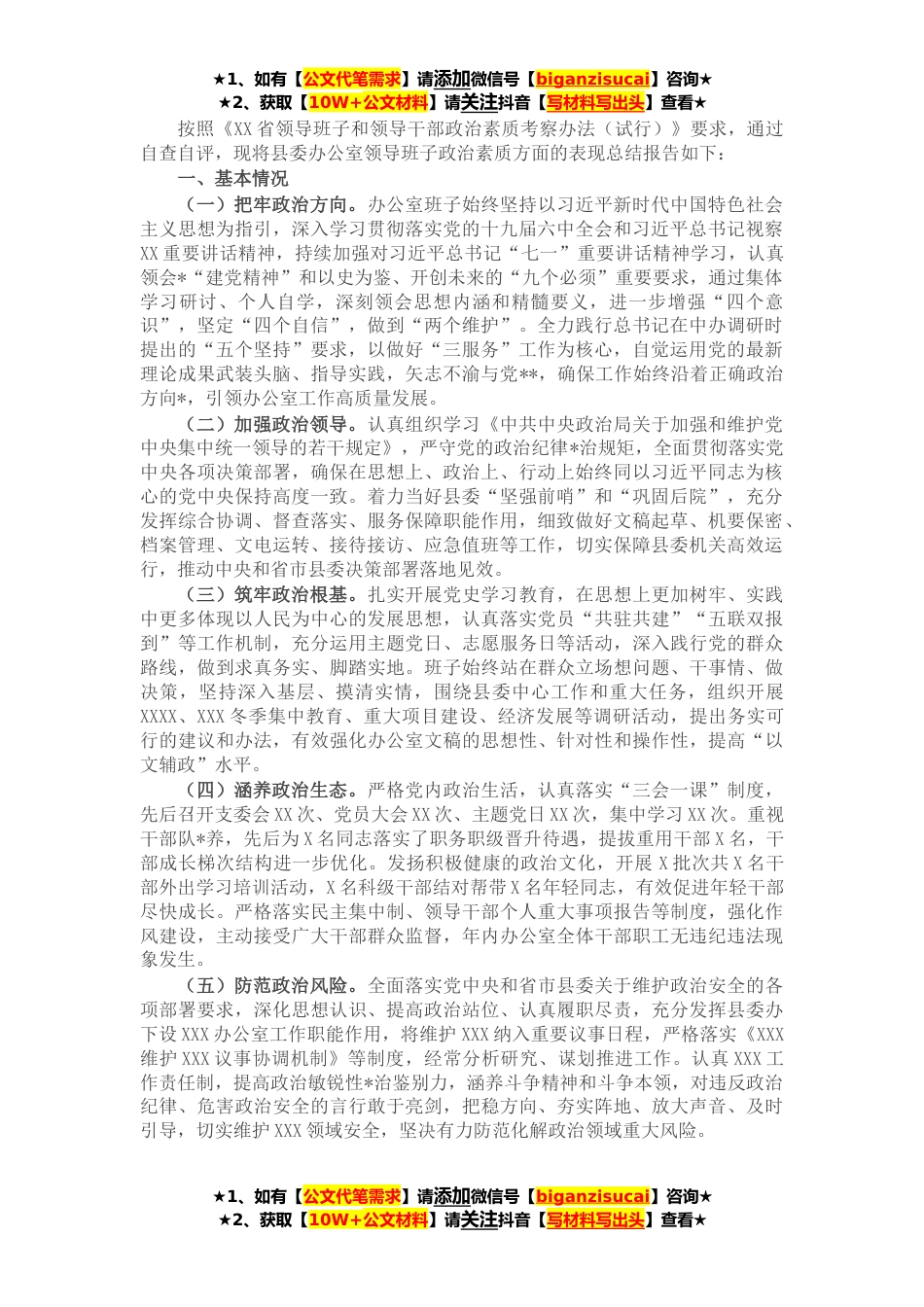 ★1、如有【公文代笔需求】请添加微信号【biganzisucai】咨询★★2、获取【10W+公文材料】请关注抖音【写材料写出头】查看★按照《XX省领导班子和领导干部政治素质考察办法(试行)》要求,通过自查自评,现将县委办公室领导班子政治素质方面的表现总结报告如下:一、基本情况(一)把牢政治方向。办公室班子始终坚持以习近平新时代中国特色社会主义思想为指引,深入学习贯彻落实党的十九届六中全会和习近平总书记视察XX重要讲话精神,持续加强对习近平总书记“七一”重要讲话精神学习,认真领会*“建党精神”和以史为鉴、开创未来的“九个必须”重要要求,通过集体学习研讨、个人自学,深刻领会思想内涵和精髓要义,进一步增强“四个意识”,坚定“四个自信”,做到“两个维护”。全力践行总书记在中办调研时提出...