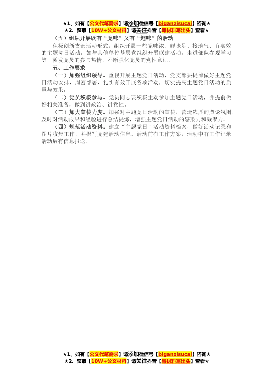 ★1、如有【公文代笔需求】请添加微信号【biganzisucai】咨询★★2、获取【10W+公文材料】请关注抖音【写材料写出头】查看★为进一步加强机关基层党组织建设,全面提升基层党建工作标准化、规范化水平,进一步严肃政治纪律*治规矩,推动全面从严治党要求落地落实,结合市政协机关工作实际,制定**年市政协机关党支部主题党日活动方案。一、指导思想坚持以XXX新时代中国特色社会主义思想为指导,深入贯彻党的十九大和XX届X中X会精神,认真贯彻落实中央、省委和市委关于加强基层党建工作的决策部署,紧紧围绕中心、服务大局,充分发挥党组织的战斗堡垒作用和党员的先锋模范作用,进一步创新党支部组织生活方式,提高组织生活活力和品位,增强党组织和党员队*创造力、凝聚力、战斗力,为助力我市争创社会主义现代化先...