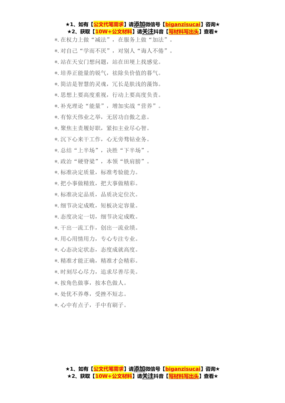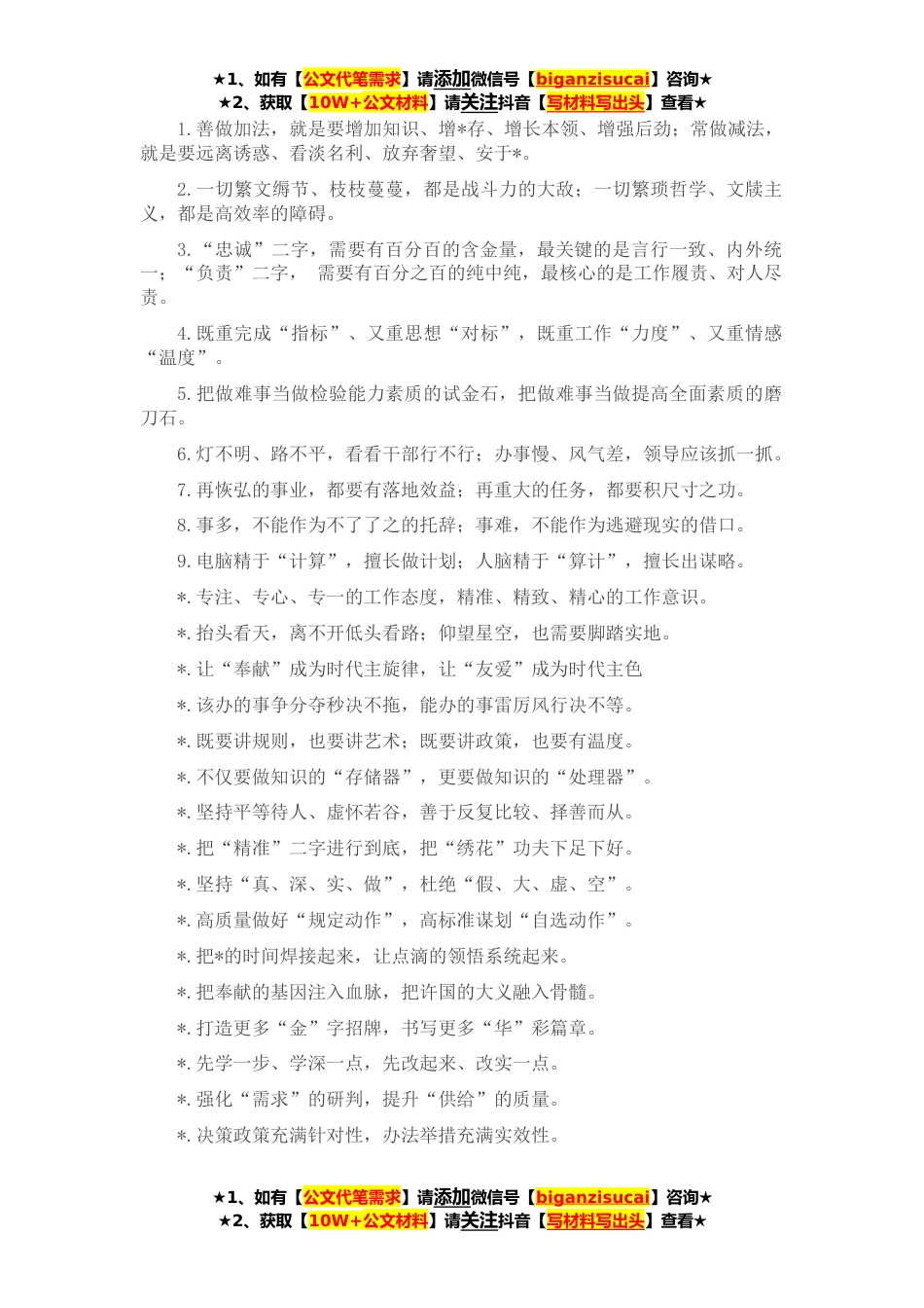 ★1、如有【公文代笔需求】请添加微信号【biganzisucai】咨询★★2、获取【10W+公文材料】请关注抖音【写材料写出头】查看★1.善做加法,就是要增加知识、增*存、增长本领、增强后劲;常做减法,就是要远离诱惑、看淡名利、放弃奢望、安于*。2.一切繁文缛节、枝枝蔓蔓,都是战斗力的大敌;一切繁琐哲学、文牍主义,都是高效率的障碍。3.“忠诚”二字,需要有百分百的含金量,最关键的是言行一致、内外统一;“负责”二字,需要有百分之百的纯中纯,最核心的是工作履责、对人尽责。4.既重完成“指标”、又重思想“对标”,既重工作“力度”、又重情感“温度”。5.把做难事当做检验能力素质的试金石,把做难事当做提高全面素质的磨刀石。6.灯不明、路不平,看看干部行不行;办事慢、风气差,领导应该抓一抓。7.再恢...