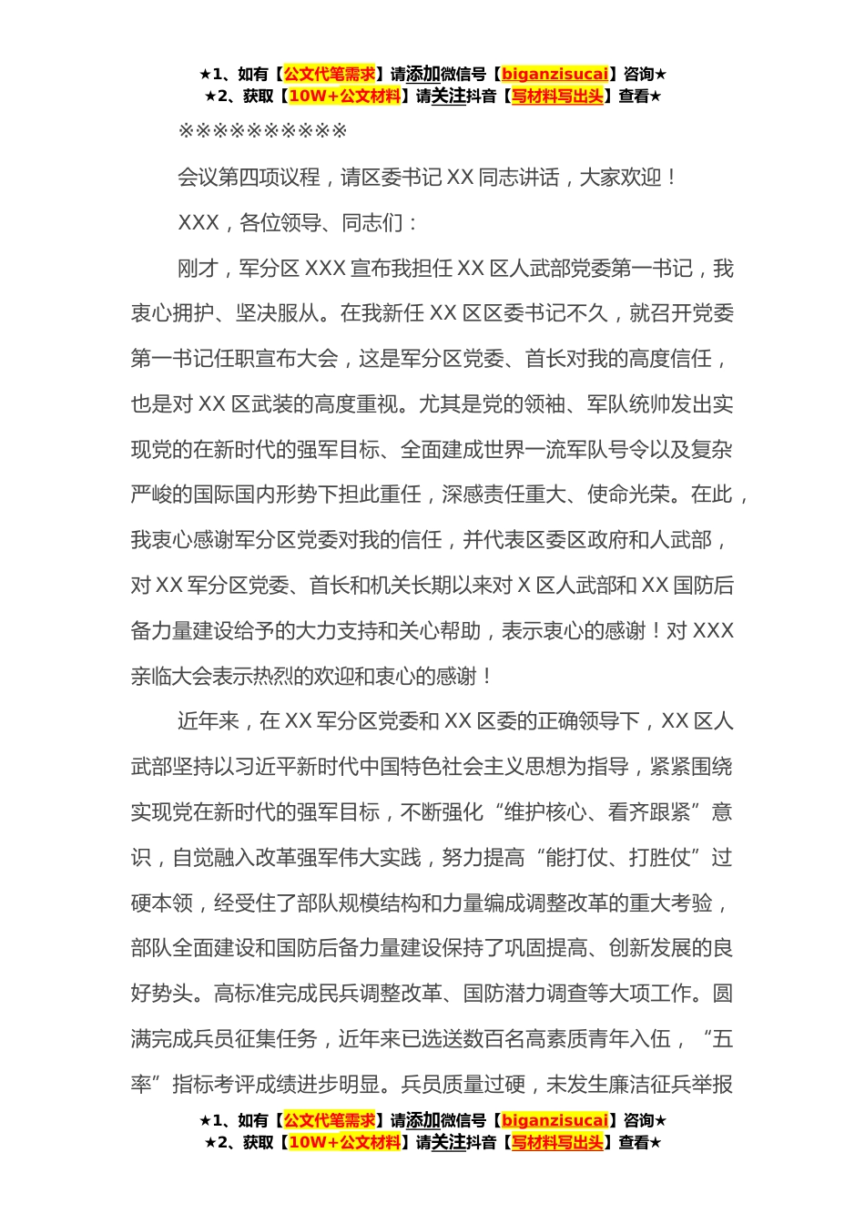 ★1、如有【公文代笔需求】请添加微信号【biganzisucai】咨询★★2、获取【10W+公文材料】请关注抖音【写材料写出头】查看★人武部党委第一书记任职大会主持词及讲话同志们:今天,大家备受尊敬的区委书记XXX同志光荣兼任区人武部党委第一书记。军分区党委首长对这次任职仪式高度重视,XXX到这里亲自宣布任职通知,一会儿还要作重要指示,这是军分区党委首长对我们XX区党管武装工作的充分肯定和高度重视,也是对人武部全面建设的极*心和厚爱。在此,我代表人武部全体干部、文职人员和职工,对首长的到来表示衷心的感谢和热烈的欢迎。参加今天会议的有:军分区XXX、区委XX书记、区人武部XX部长、区人武部XX政委以及各镇(街)党(工)委书记,各部委办局和各乡镇(街道)专武干部。这次会议共六项议程:首先进行第...