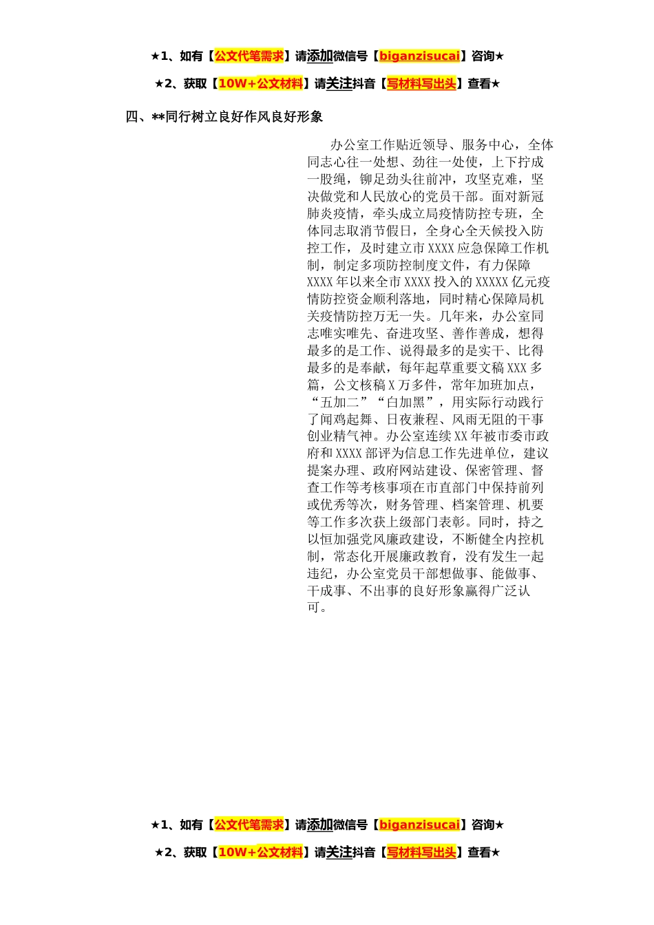 ★1、如有【公文代笔需求】请添加微信号【biganzisucai】咨询★★2、获取【10W+公文材料】请关注抖音【写材料写出头】查看★近年来,市XX局办公室认真贯彻落实习近平总书记关于机关党的建设的重要论述,深入践行习近平总书记对办公局(室)工作提出的“五个坚持”重要要求,扎实开展具有办公室特色的模范机关创建活动,助力提升“三服务”工作水平,更好地服务中心保障大局,先后获得全国XX系统先进集体、省、市先进基层党组织等荣誉称号。一、时时事事处处忠诚核心、拥戴核心、维护核心、捍卫核心牢记XX部门首先是政治机关,深刻认识旗帜鲜明讲政治是做好办公室工作的根本点,坚持走在前列作好表率,时刻做政治上的明白人。坚持把“两个维护”作为一切工作的最高准则,贯穿到工作的全过程各方面,持续提升政治判断...