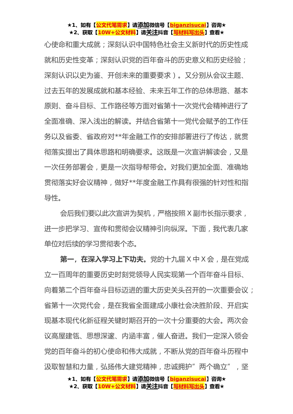 ★1、如有【公文代笔需求】请添加微信号【biganzisucai】咨询★★2、获取【10W+公文材料】请关注抖音【写材料写出头】查看★在市领导宣讲党的十九六精神和省党代会精神宣讲会上的主持词各位领导,同志们:新年伊始,万象更新。今天,我们在金融办聚集,主要目的是:聆听X副市长宣讲党的十九届X中X会和省第十一次党代会精神。党的十九届X中X会和省第十一次党代会召开以来,各单位都采取不同形式进行了学习宣传和贯彻落实。今天,X副市长在百忙之中再次给我们进行面对面宣讲解读,对我们进一步全面、深入、系统地学习好、领会好、贯彻好两次重要会议的精神实质、准确把握深刻内涵,具有十分重要的意义。参加今天宣讲会的有:市XXX在家全体干部职工、人民银行XXX中心支行、XXX银保监分局、市财通公司和XXX融资担保公...