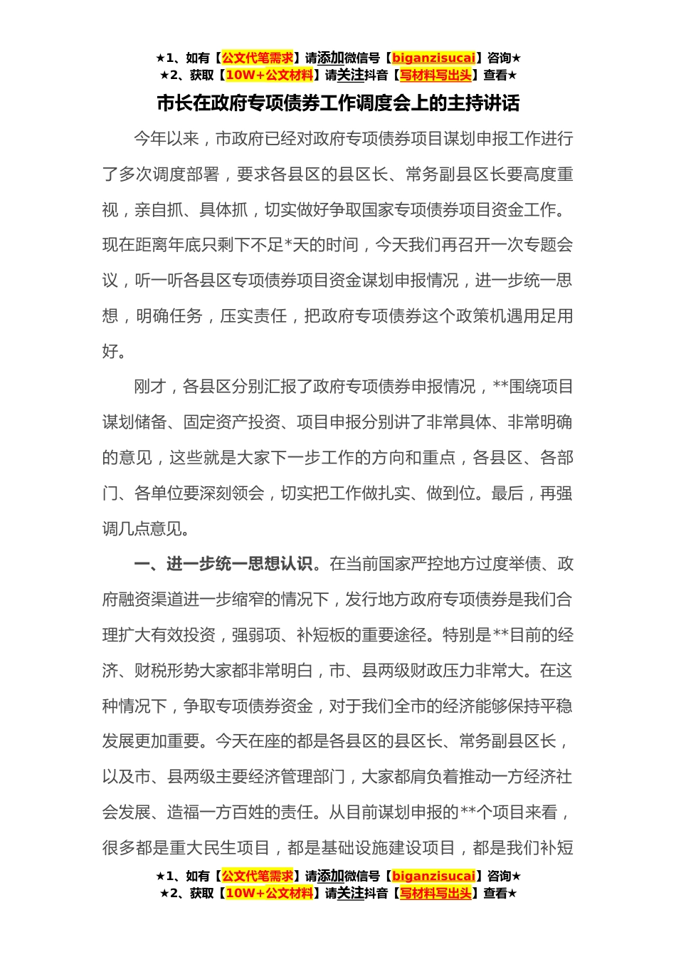 ★1、如有【公文代笔需求】请添加微信号【biganzisucai】咨询★★2、获取【10W+公文材料】请关注抖音【写材料写出头】查看★市长在政府专项债券工作调度会上的主持讲话今年以来,市政府已经对政府专项债券项目谋划申报工作进行了多次调度部署,要求各县区的县区长、常务副县区长要高度重视,亲自抓、具体抓,切实做好争取国家专项债券项目资金工作。现在距离年底只剩下不足*天的时间,今天我们再召开一次专题会议,听一听各县区专项债券项目资金谋划申报情况,进一步统一思想,明确任务,压实责任,把政府专项债券这个政策机遇用足用好。刚才,各县区分别汇报了政府专项债券申报情况,**围绕项目谋划储备、固定资产投资、项目申报分别讲了非常具体、非常明确的意见,这些就是大家下一步工作的方向和重点,各县区、...