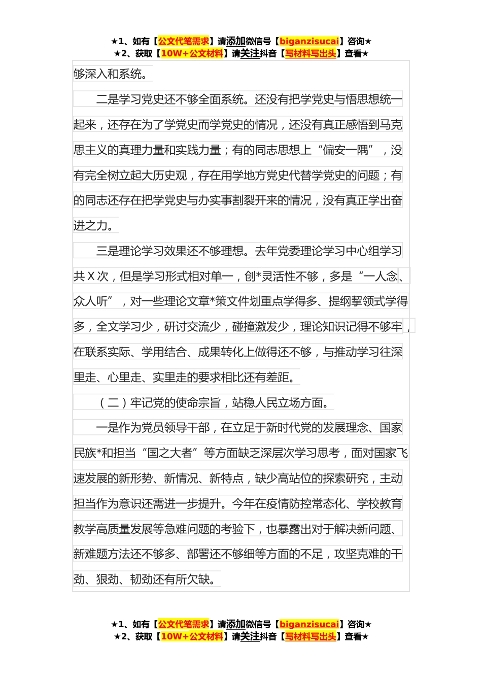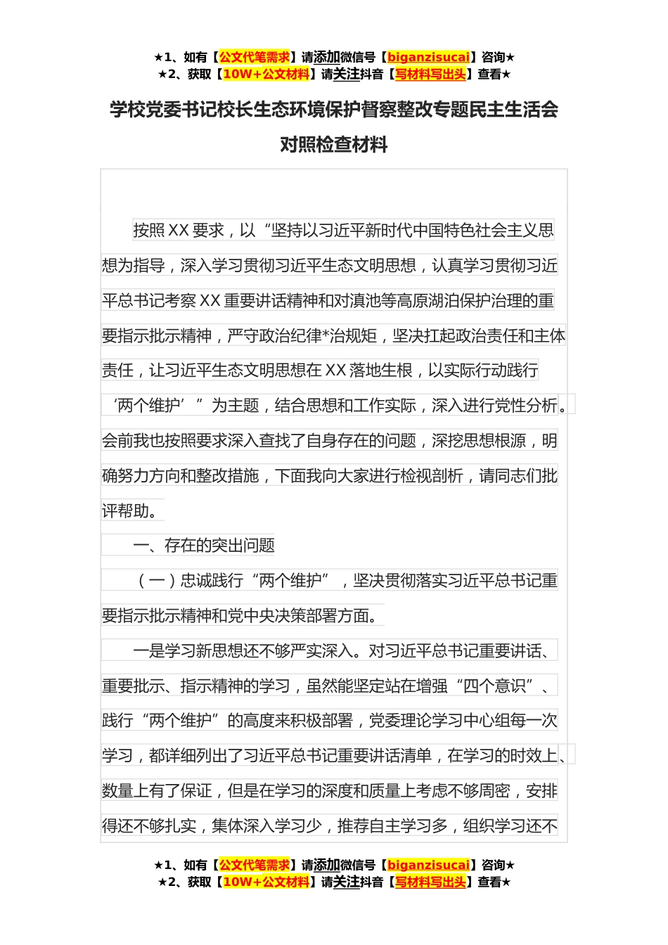 ★1、如有【公文代笔需求】请添加微信号【biganzisucai】咨询★★2、获取【10W+公文材料】请关注抖音【写材料写出头】查看★学校党委书记校长生态环境保护督察整改专题民主生活会对照检查材料按照XX要求,以“坚持以习近平新时代中国特色社会主义思想为指导,深入学习贯彻习近平生态文明思想,认真学习贯彻习近平总书记考察XX重要讲话精神和对滇池等高原湖泊保护治理的重要指示批示精神,严守政治纪律*治规矩,坚决扛起政治责任和主体责任,让习近平生态文明思想在XX落地生根,以实际行动践行‘两个维护’”为主题,结合思想和工作实际,深入进行党性分析。会前我也按照要求深入查找了自身存在的问题,深挖思想根源,明确努力方向和整改措施,下面我向大家进行检视剖析,请同志们批评帮助。一、存在的突出问题(一...