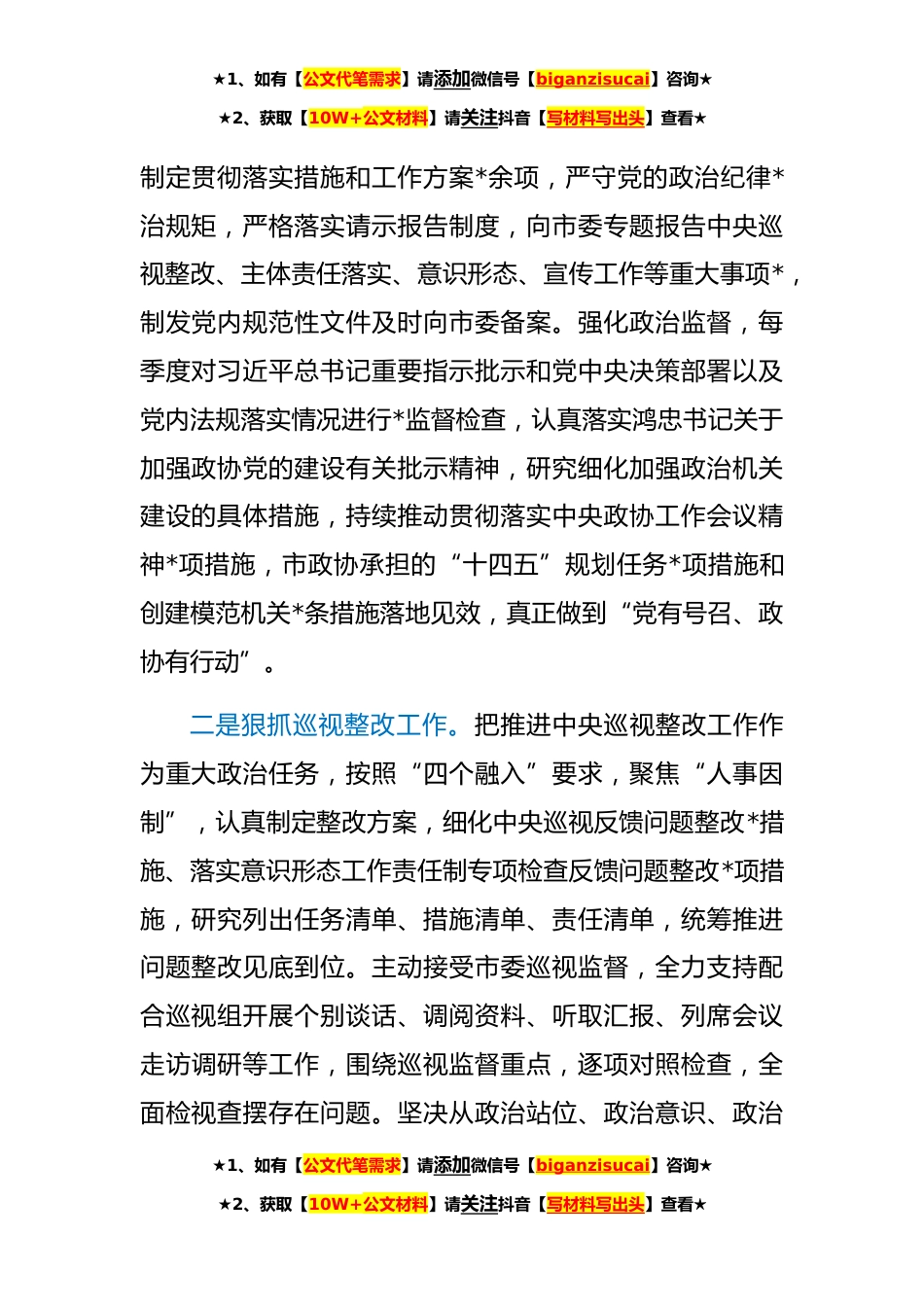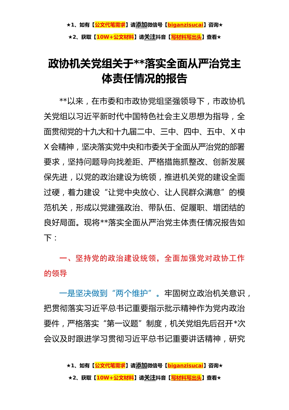 ★1、如有【公文代笔需求】请添加微信号【biganzisucai】咨询★★2、获取【10W+公文材料】请关注抖音【写材料写出头】查看★政协机关党组关于**落实全面从严治党主体责任情况的报告**以来,在市委和市政协党组坚强领导下,市政协机关党组以习近平新时代中国特色社会主义思想为指导,全面贯彻党的十九大和十九届二中、三中、四中、五中、X中X会精神,坚决落实党中央和市委关于全面从严治党的部署要求,坚持问题导向找差距、严格措施抓整改、创新发展保先进,以党的政治建设为统领,推进机关党的建设全面过硬,着力建设“让党中央放心、让人民群众满意”的模范机关,形成以党建强政治、带队伍、促履职、增团结的良好局面。现将**落实全面从严治党主体责任情况报告如下:一、坚持党的政治建设统领,全面加强党对政协...