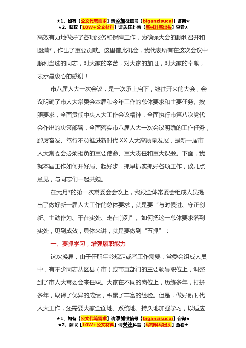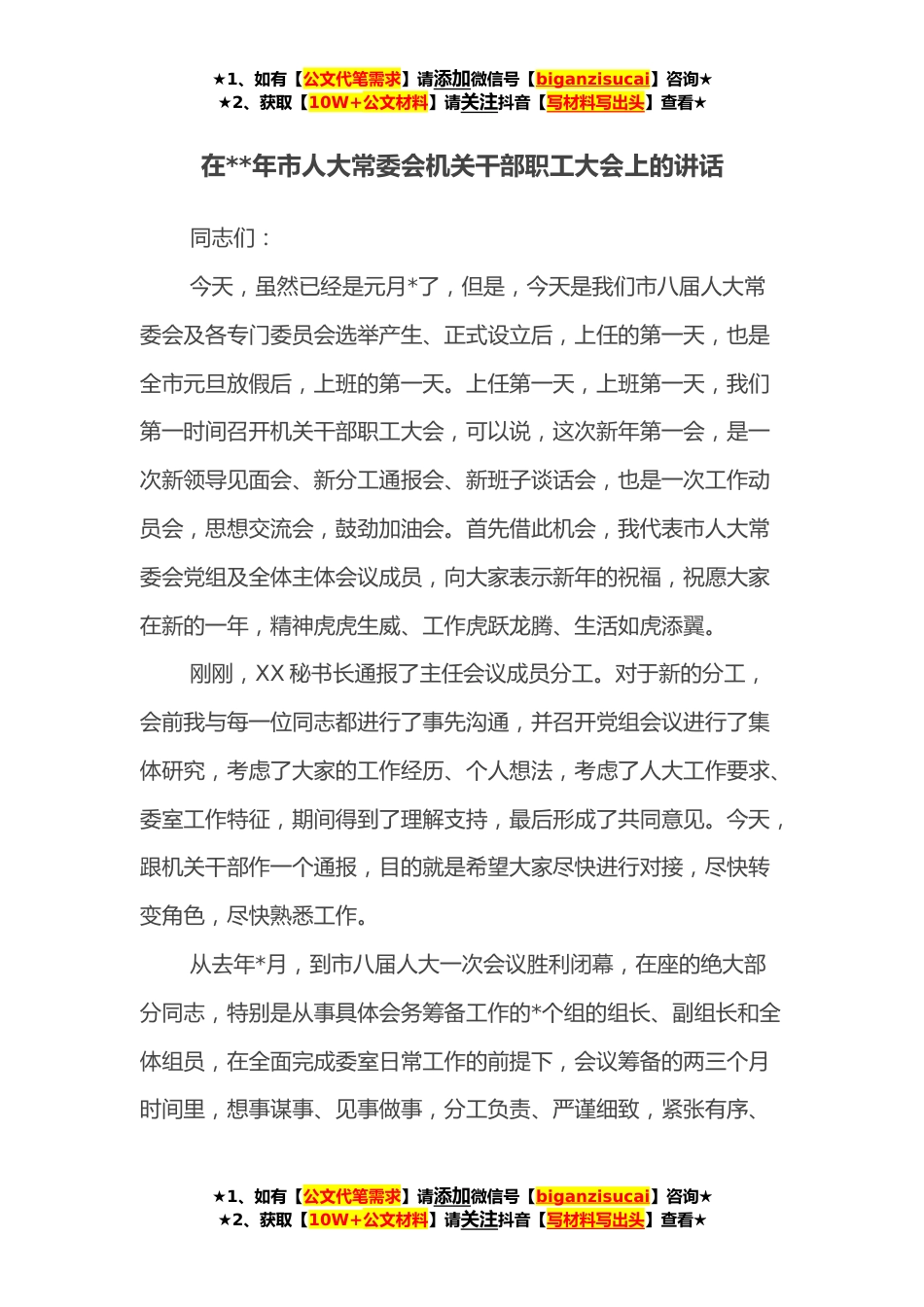 ★1、如有【公文代笔需求】请添加微信号【biganzisucai】咨询★★2、获取【10W+公文材料】请关注抖音【写材料写出头】查看★在**年市人大常委会机关干部职工大会上的讲话同志们:今天,虽然已经是元月*了,但是,今天是我们市八届人大常委会及各专门委员会选举产生、正式设立后,上任的第一天,也是全市元旦放假后,上班的第一天。上任第一天,上班第一天,我们第一时间召开机关干部职工大会,可以说,这次新年第一会,是一次新领导见面会、新分工通报会、新班子谈话会,也是一次工作动员会,思想交流会,鼓劲加油会。首先借此机会,我代表市人大常委会党组及全体主体会议成员,向大家表示新年的祝福,祝愿大家在新的一年,精神虎虎生威、工作虎跃龙腾、生活如虎添翼。刚刚,XX秘书长通报了主任会议成员分工。对于...