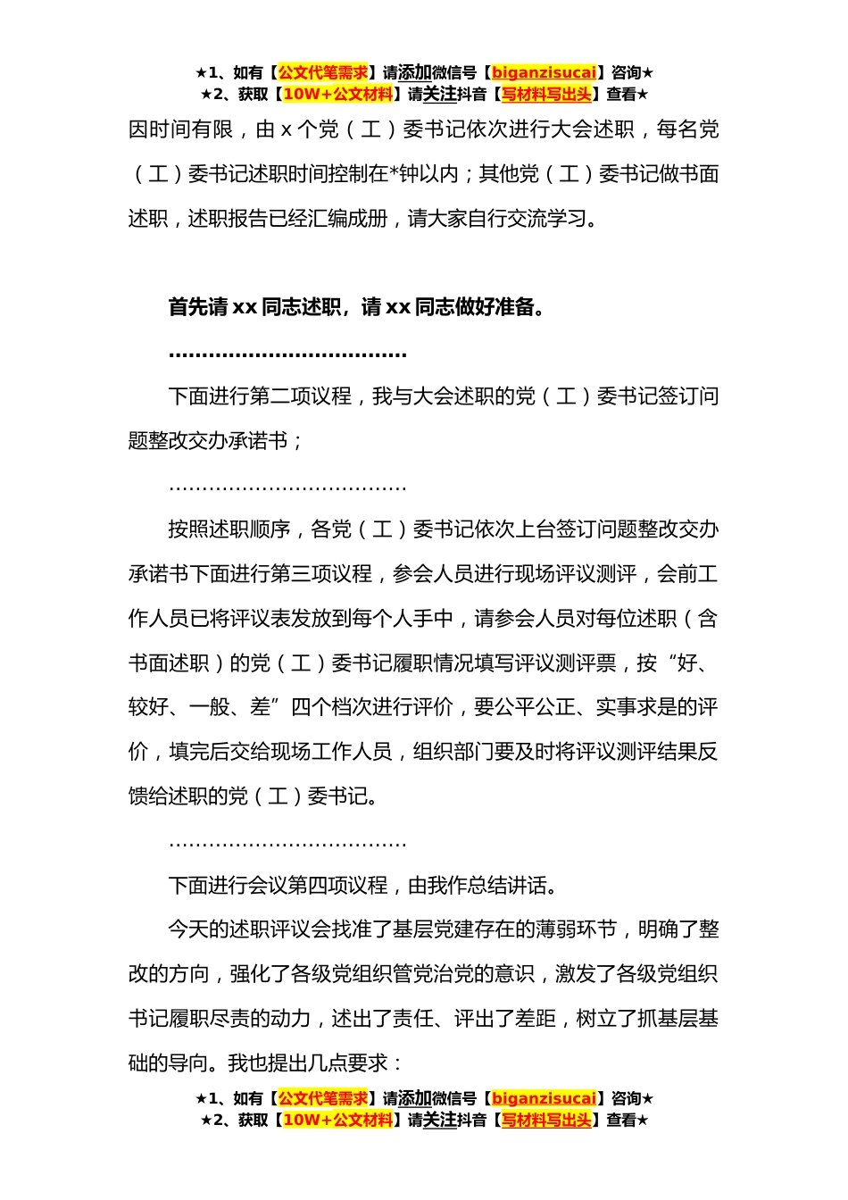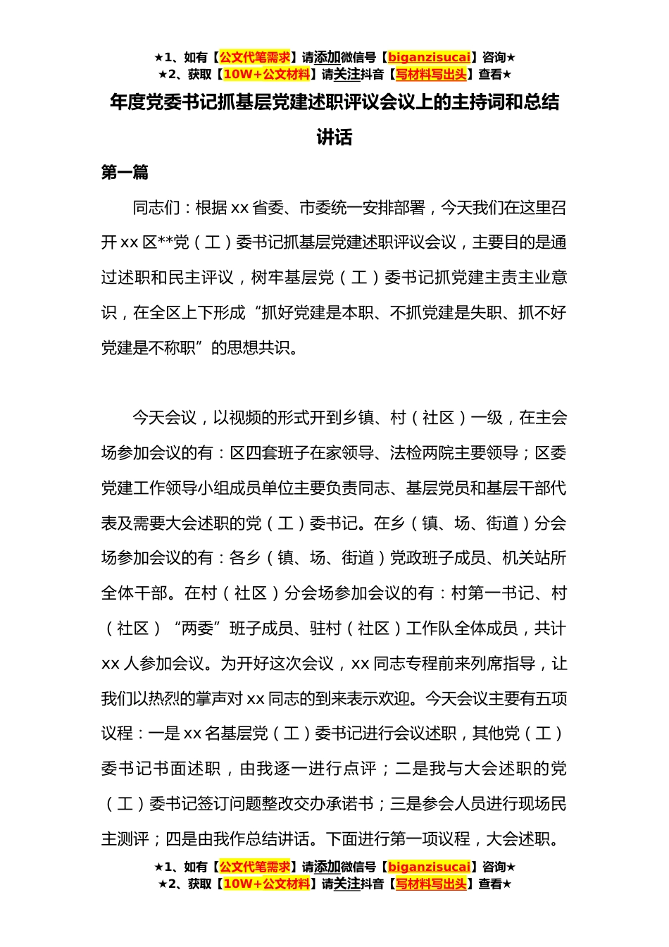 ★1、如有【公文代笔需求】请添加微信号【biganzisucai】咨询★★2、获取【10W+公文材料】请关注抖音【写材料写出头】查看★年度党委书记抓基层党建述职评议会议上的主持词和总结讲话第一篇同志们:根据xx省委、市委统一安排部署,今天我们在这里召开xx区**党(工)委书记抓基层党建述职评议会议,主要目的是通过述职和民主评议,树牢基层党(工)委书记抓党建主责主业意识,在全区上下形成“抓好党建是本职、不抓党建是失职、抓不好党建是不称职”的思想共识。今天会议,以视频的形式开到乡镇、村(社区)一级,在主会场参加会议的有:区四套班子在家领导、法检两院主要领导;区委党建工作领导小组成员单位主要负责同志、基层党员和基层干部代表及需要大会述职的党(工)委书记。在乡(镇、场、街道)分会场参加...