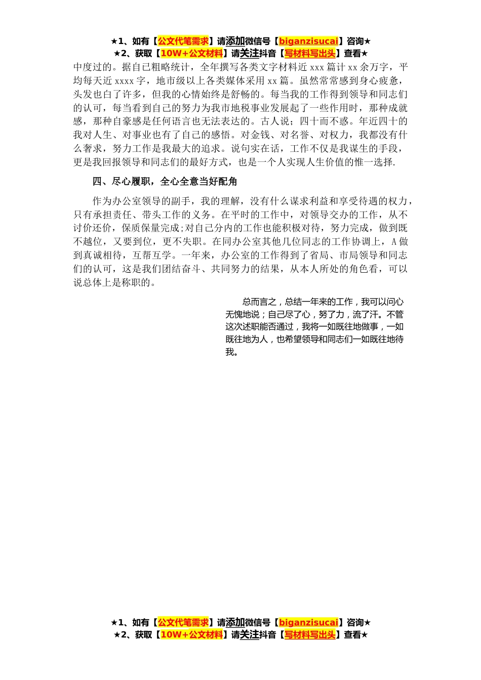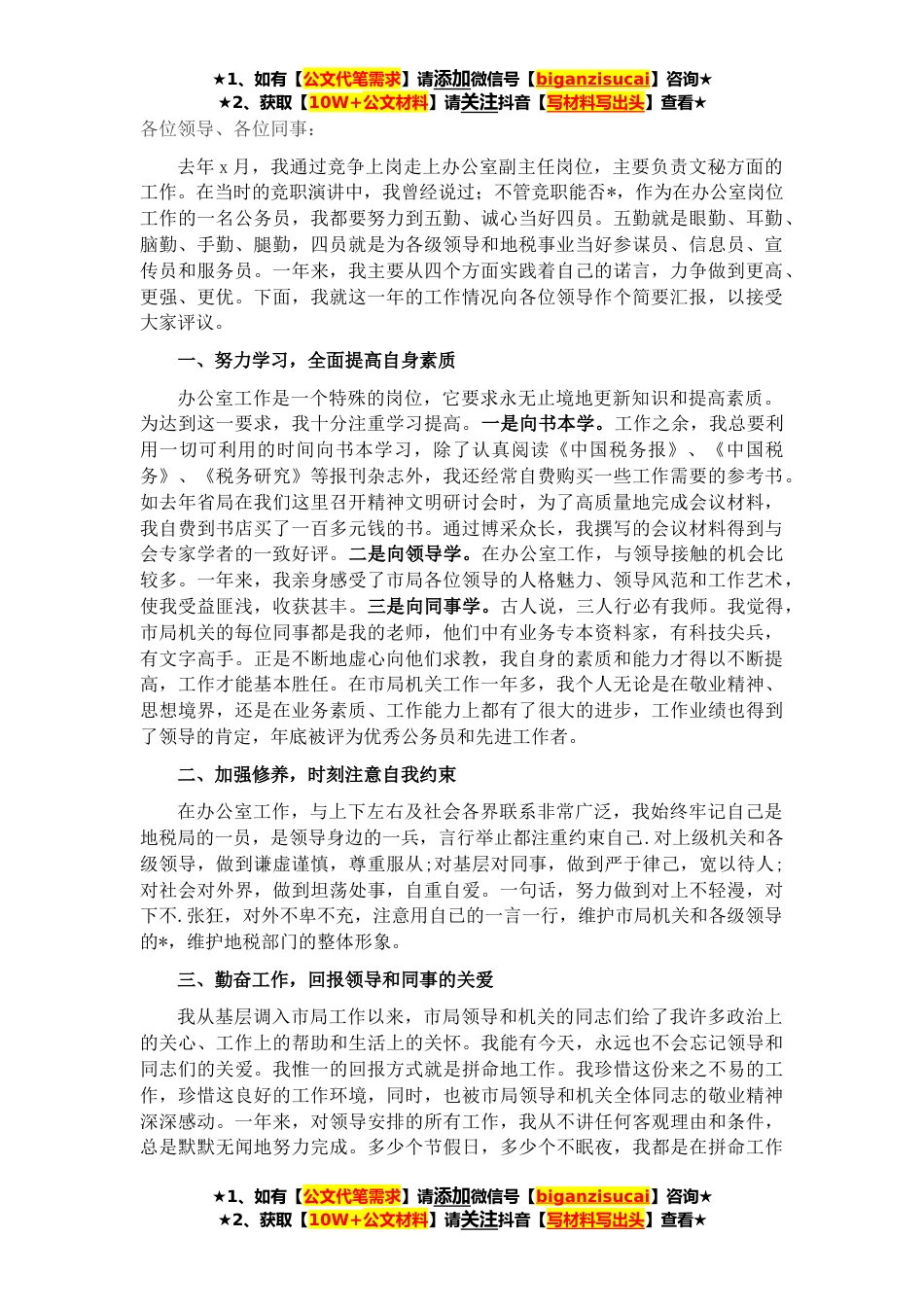 ★1、如有【公文代笔需求】请添加微信号【biganzisucai】咨询★★2、获取【10W+公文材料】请关注抖音【写材料写出头】查看★各位领导、各位同事:去年x月,我通过竞争上岗走上办公室副主任岗位,主要负责文秘方面的工作。在当时的竞职演讲中,我曾经说过;不管竞职能否*,作为在办公室岗位工作的一名公务员,我都要努力到五勤、诚心当好四员。五勤就是眼勤、耳勤、脑勤、手勤、腿勤,四员就是为各级领导和地税事业当好参谋员、信息员、宣传员和服务员。一年来,我主要从四个方面实践着自己的诺言,力争做到更高、更强、更优。下面,我就这一年的工作情况向各位领导作个简要汇报,以接受大家评议。一、努力学习,全面提高自身素质办公室工作是一个特殊的岗位,它要求永无止境地更新知识和提高素质。为达到这一要求...