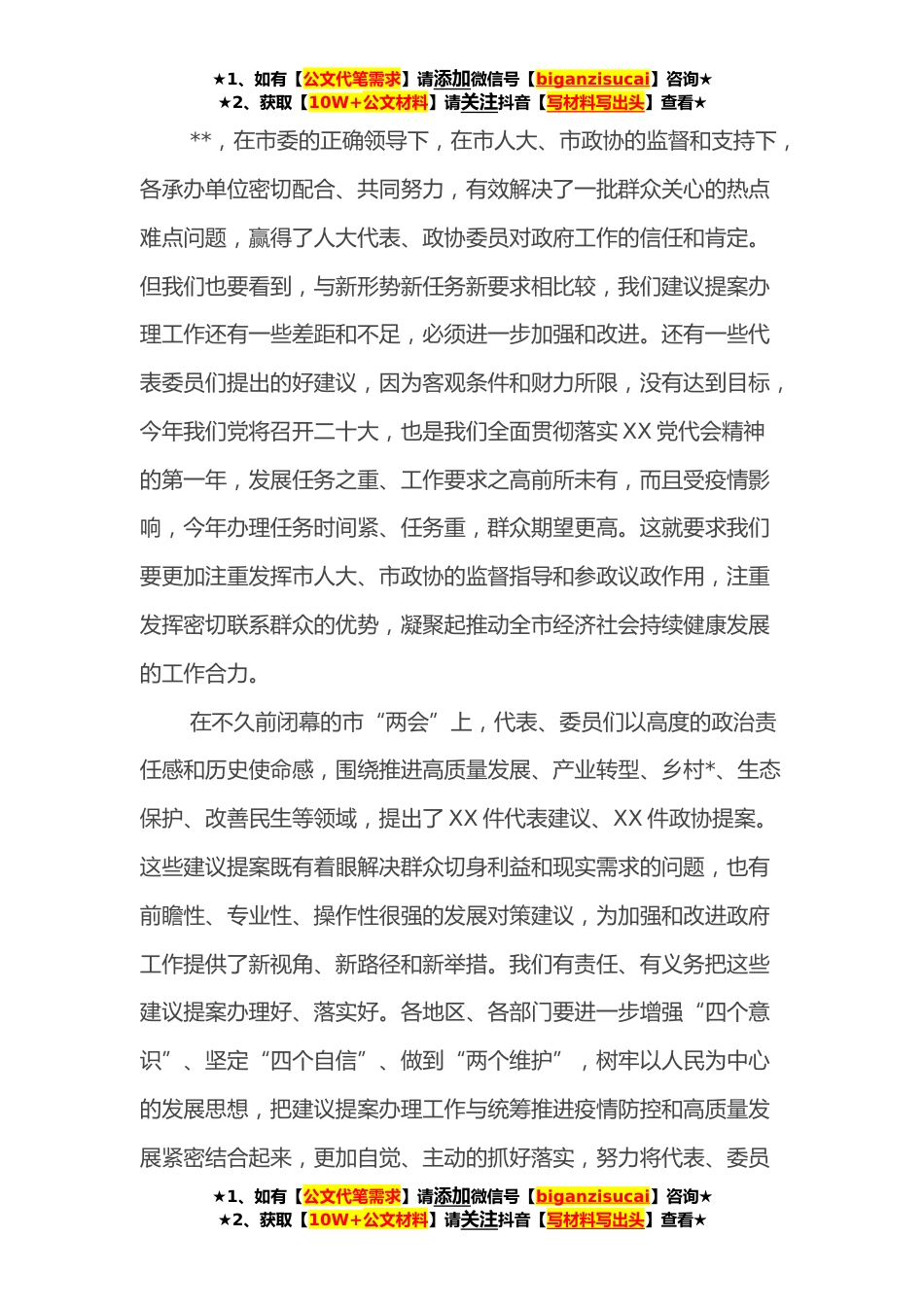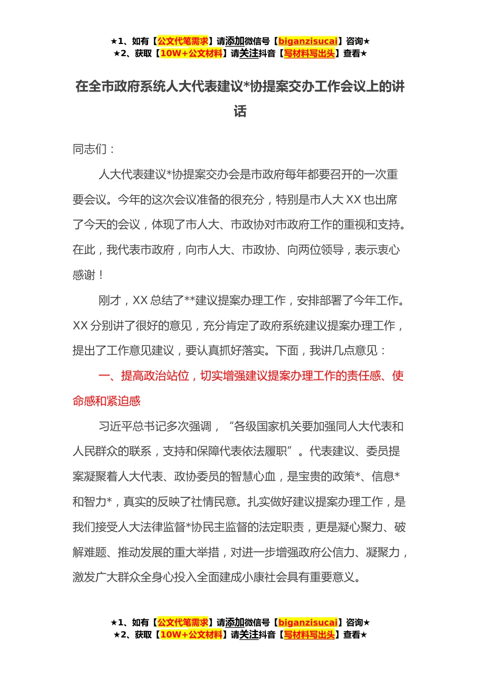 ★1、如有【公文代笔需求】请添加微信号【biganzisucai】咨询★★2、获取【10W+公文材料】请关注抖音【写材料写出头】查看★在全市政府系统人大代表建议*协提案交办工作会议上的讲话同志们:人大代表建议*协提案交办会是市政府每年都要召开的一次重要会议。今年的这次会议准备的很充分,特别是市人大XX也出席了今天的会议,体现了市人大、市政协对市政府工作的重视和支持。在此,我代表市政府,向市人大、市政协、向两位领导,表示衷心感谢!刚才,XX总结了**建议提案办理工作,安排部署了今年工作。XX分别讲了很好的意见,充分肯定了政府系统建议提案办理工作,提出了工作意见建议,要认真抓好落实。下面,我讲几点意见:一、提高政治站位,切实增强建议提案办理工作的责任感、使命感和紧迫感习近平总书记多次强...