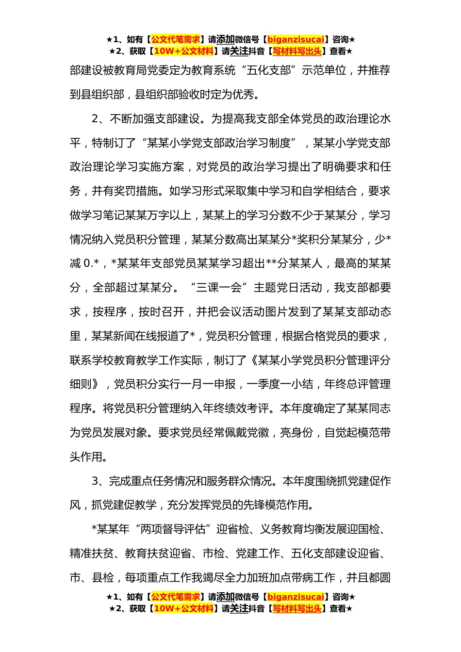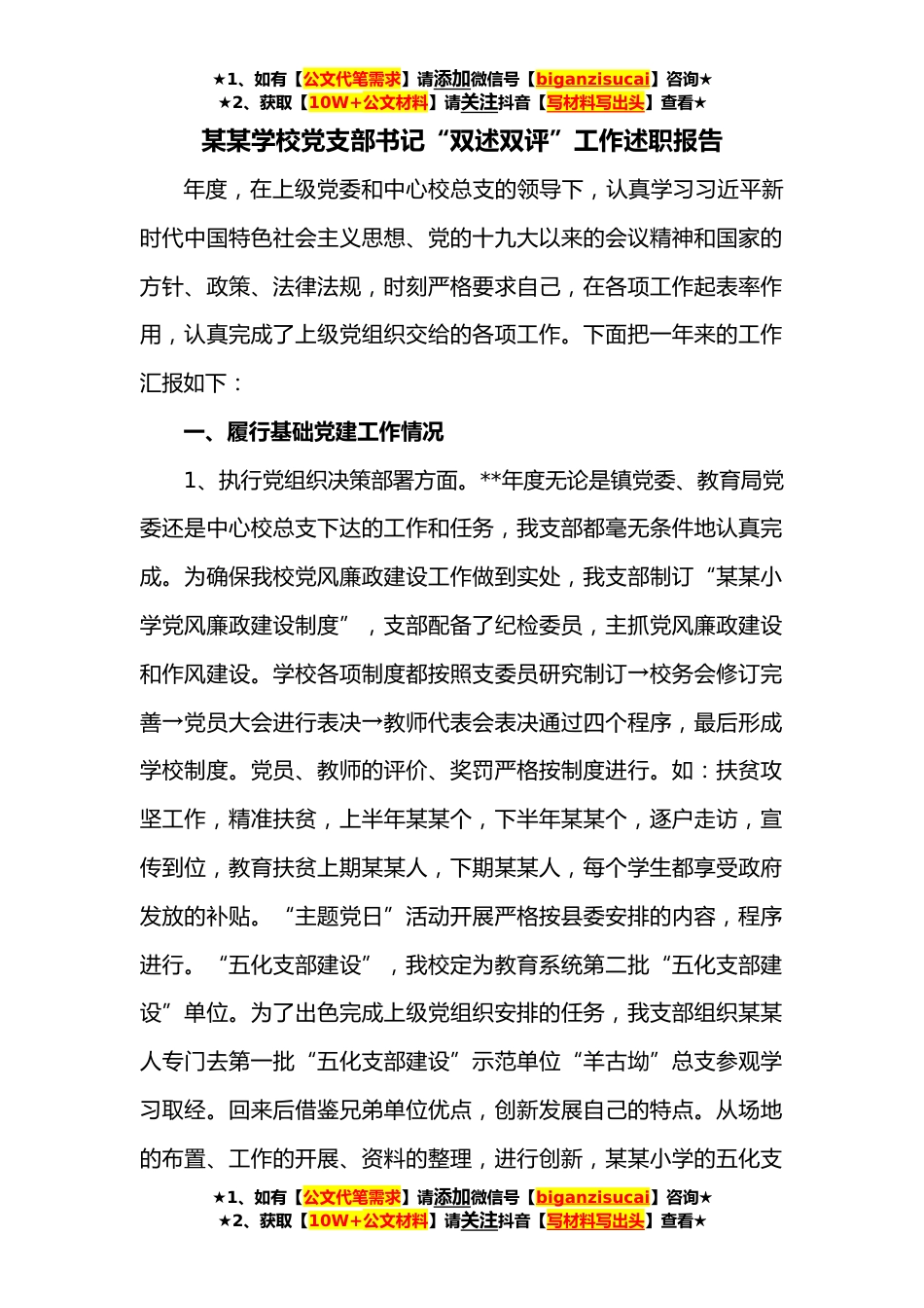 ★1、如有【公文代笔需求】请添加微信号【biganzisucai】咨询★★2、获取【10W+公文材料】请关注抖音【写材料写出头】查看★某某学校党支部书记“双述双评”工作述职报告年度,在上级党委和中心校总支的领导下,认真学习习近平新时代中国特色社会主义思想、党的十九大以来的会议精神和国家的方针、政策、法律法规,时刻严格要求自己,在各项工作起表率作用,认真完成了上级党组织交给的各项工作。下面把一年来的工作汇报如下:一、履行基础党建工作情况1、执行党组织决策部署方面。**年度无论是镇党委、教育局党委还是中心校总支下达的工作和任务,我支部都毫无条件地认真完成。为确保我校党风廉政建设工作做到实处,我支部制订“某某小学党风廉政建设制度”,支部配备了纪检委员,主抓党风廉政建设和作风建设。学...