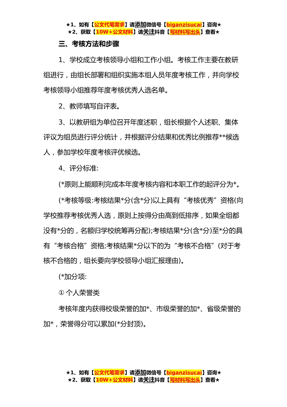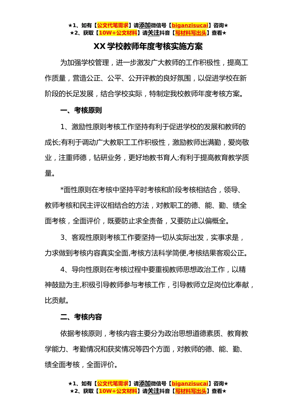 ★1、如有【公文代笔需求】请添加微信号【biganzisucai】咨询★★2、获取【10W+公文材料】请关注抖音【写材料写出头】查看★XX学校教师年度考核实施方案为加强学校管理,进一步激发广大教师的工作积极性,提高工作质量,营造公正、公平、公开评教的良好氛围,以促进学校在新阶段的长足发展,结合学校实际,特制定我校教师年度考核方案。一、考核原则1、激励性原则考核工作坚持有利于促进学校的发展和教师的成长;有利于调动广大教职工工作积极性,激励教师出满勤,爱岗敬业,注重师德,钻研业务,更好地教书育人;有利于提高教育教学质量。*面性原则在考核中坚持平时考核和阶段考核相结合,领导、教师考核和民主评议相结合的方法,对教职工的德、能、勤、绩全面考核,全面评价,既要防止求全责备,又要防止以偏概全...