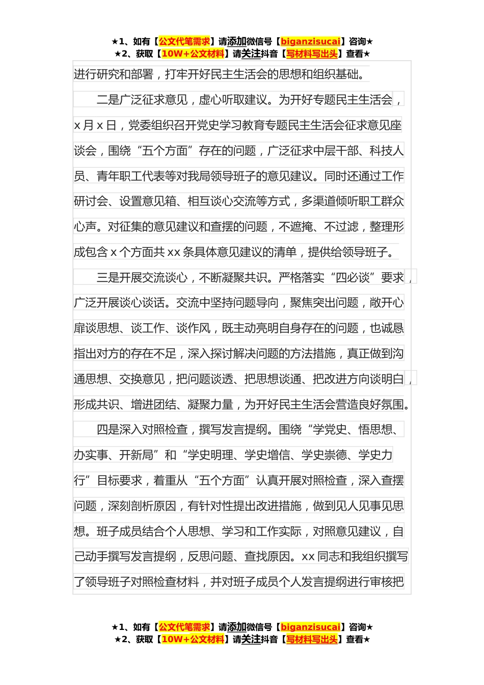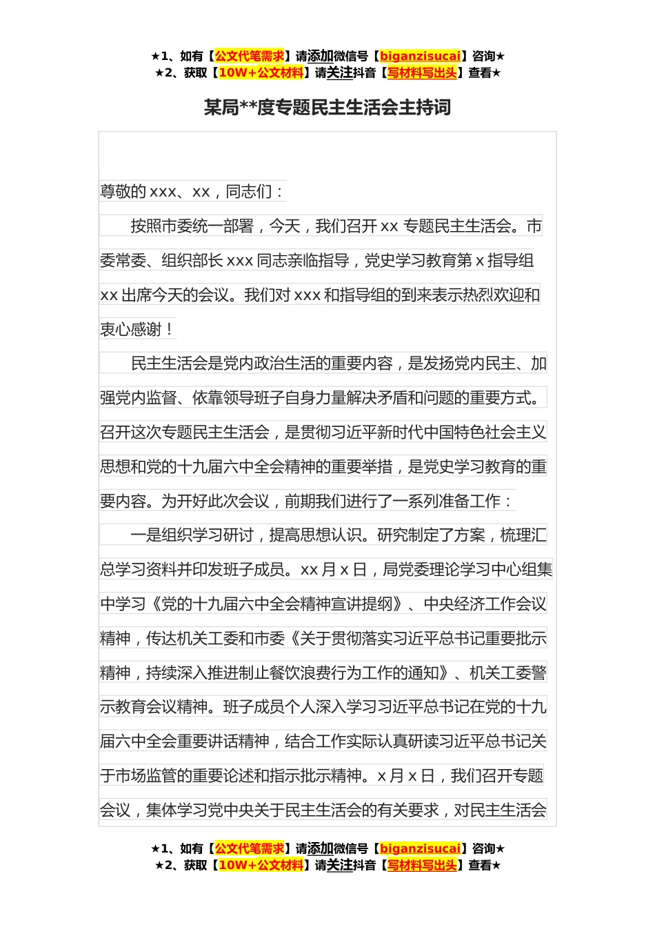 ★1、如有【公文代笔需求】请添加微信号【biganzisucai】咨询★★2、获取【10W+公文材料】请关注抖音【写材料写出头】查看★某局**度专题民主生活会主持词尊敬的xxx、xx,同志们:按照市委统一部署,今天,我们召开xx专题民主生活会。市委常委、组织部长xxx同志亲临指导,党史学习教育第x指导组xx出席今天的会议。我们对xxx和指导组的到来表示热烈欢迎和衷心感谢!民主生活会是党内政治生活的重要内容,是发扬党内民主、加强党内监督、依靠领导班子自身力量解决矛盾和问题的重要方式。召开这次专题民主生活会,是贯彻习近平新时代中国特色社会主义思想和党的十九届六中全会精神的重要举措,是党史学习教育的重要内容。为开好此次会议,前期我们进行了一系列准备工作:一是组织学习研讨,提高思想认识。研究制定了...