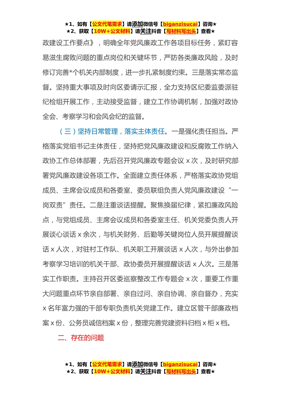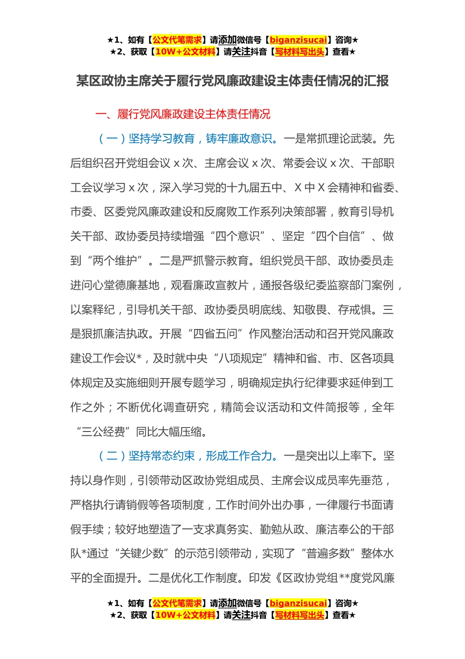 ★1、如有【公文代笔需求】请添加微信号【biganzisucai】咨询★★2、获取【10W+公文材料】请关注抖音【写材料写出头】查看★某区政协主席关于履行党风廉政建设主体责任情况的汇报一、履行党风廉政建设主体责任情况(一)坚持学习教育,铸牢廉政意识。一是常抓理论武装。先后组织召开党组会议x次、主席会议x次、常委会议x次、干部职工会议学习x次,深入学习党的十九届五中、X中X会精神和省委、市委、区委党风廉政建设和反腐败工作系列决策部署,教育引导机关干部、政协委员持续增强“四个意识”、坚定“四个自信”、做到“两个维护”。二是严抓警示教育。组织党员干部、政协委员走进问心堂德廉基地,观看廉政宣教片,通报各级纪委监察部门案例,以案释纪,引导机关干部、政协委员明底线、知敬畏、存戒惧。三是狠抓...