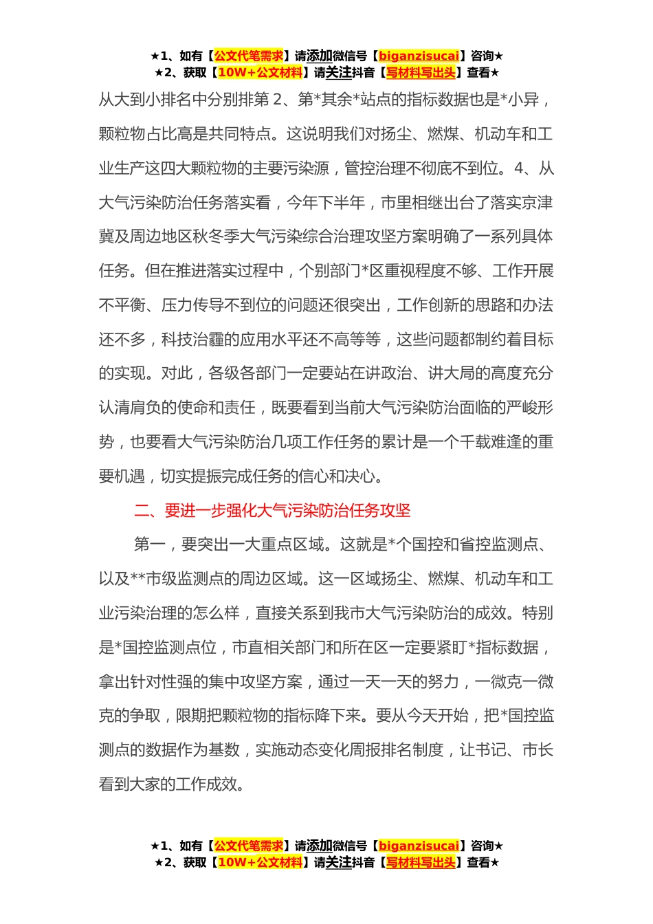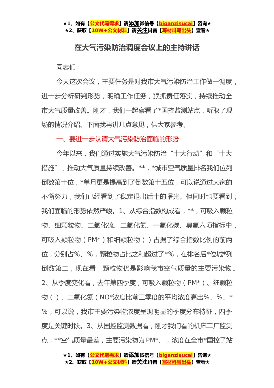 ★1、如有【公文代笔需求】请添加微信号【biganzisucai】咨询★★2、获取【10W+公文材料】请关注抖音【写材料写出头】查看★在大气污染防治调度会议上的主持讲话同志们:今天这次会议,主要任务是对我市大气污染防治工作做一调度,进一步分析研判形势,明确工作任务,狠抓责任落实,持续推动全市大气质量改善。刚才,我们一起察看了*国控监测站点,听取了现场的情况介绍。下面我再讲几点意见,供大家参考。一、要进一步认清大气污染防治面临的形势今年以来,我们通过实施大气污染防治“十大行动”和“十大措施”,推动大气质量持续改善。**,*城市空气质量排名我们位列倒数第十位,*单月更是提高到了倒数第十五位,可以说通过大家的不懈努力,我们已经看到了稳定退出后十的曙光。但同时也要看到,我们面临的形势依...