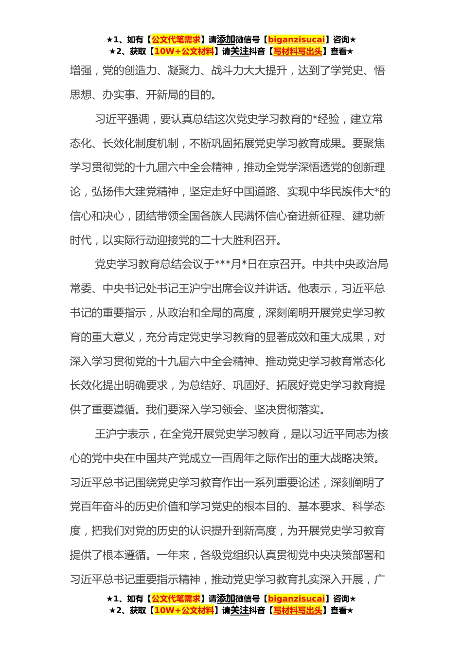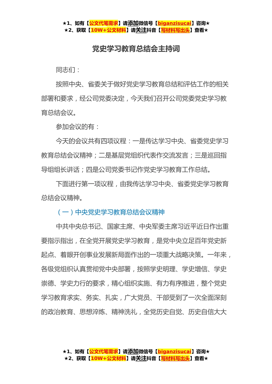 ★1、如有【公文代笔需求】请添加微信号【biganzisucai】咨询★★2、获取【10W+公文材料】请关注抖音【写材料写出头】查看★党史学习教育总结会主持词同志们:按照中央、省委关于做好党史学习教育总结和评估工作的相关部署和要求,经公司党委决定,今天我们召开公司党委党史学习教育总结会议。参加会议的有:今天的会议共有四项议程:一是传达学习中央、省委党史学习教育总结会议精神;二是基层党组织代表作交流发言;三是巡回指导组组长讲话;四是公司党委书记作党史学习教育工作总结。下面进行第一项议程,由我传达学习中央、省委党史学习教育总结会议精神。(一)中央党史学习教育总结会议精神中共中央总书记、国家主席、中央军委主席习近平近日作出重要指示指出,在全党开展党史学习教育,是党中央立足百年党...