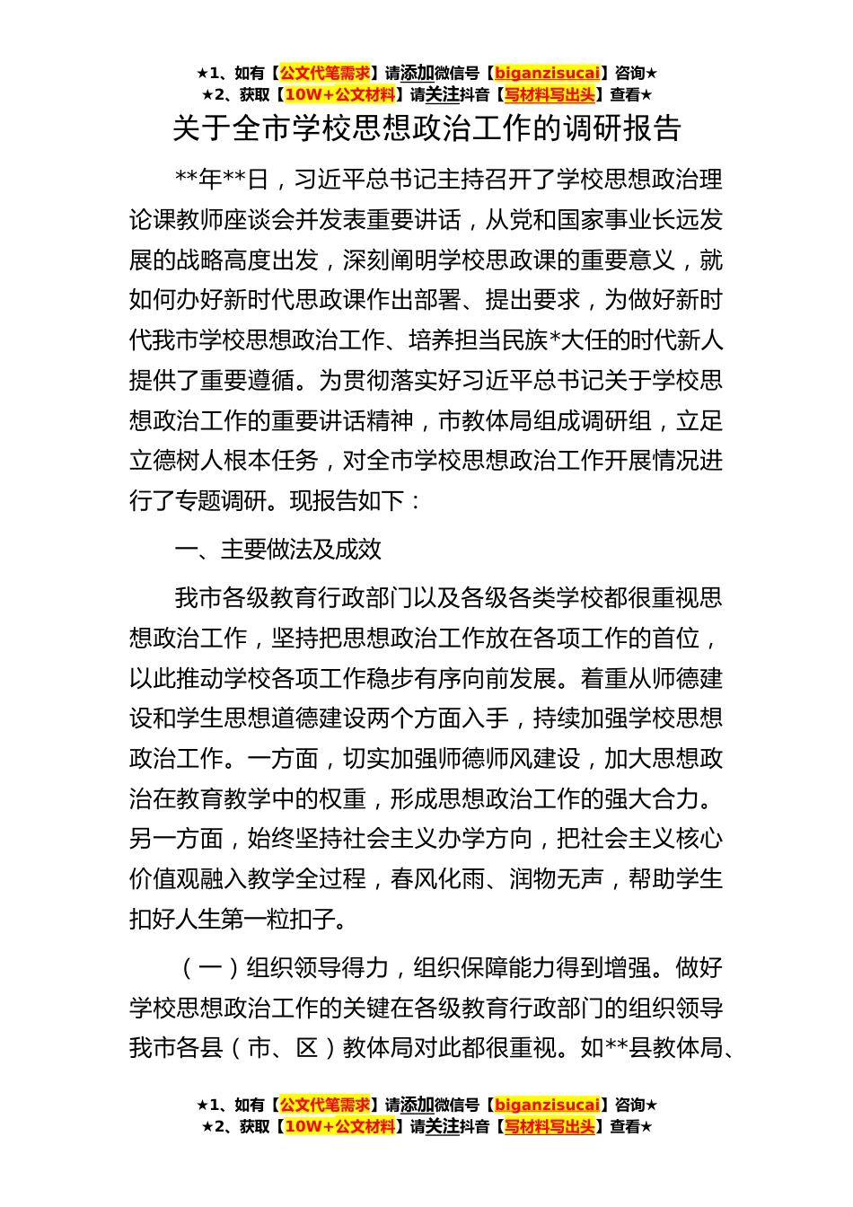 ★1、如有【公文代笔需求】请添加微信号【biganzisucai】咨询★★2、获取【10W+公文材料】请关注抖音【写材料写出头】查看★★1、如有【公文代笔需求】请添加微信号【biganzisucai】咨询★★2、获取【10W+公文材料】请关注抖音【写材料写出头】查看★★1、如有【公文代笔需求】请添加微信号【biganzisucai】咨询★★2、获取【10W+公文材料】请关注抖音【写材料写出头】查看★关于全市学校思想政治工作的调研报告**年**日,习近平总书记主持召开了学校思想政治理论课教师座谈会并发表重要讲话,从党和国家事业长远发展的战略高度出发,深刻阐明学校思政课的重要意义,就如何办好新时代思政课作出部署、提出要求,为做好新时代我市学校思想政治工作、培养担当民族*大任的时代新人提供了重要遵循。为贯彻落实好习近平...