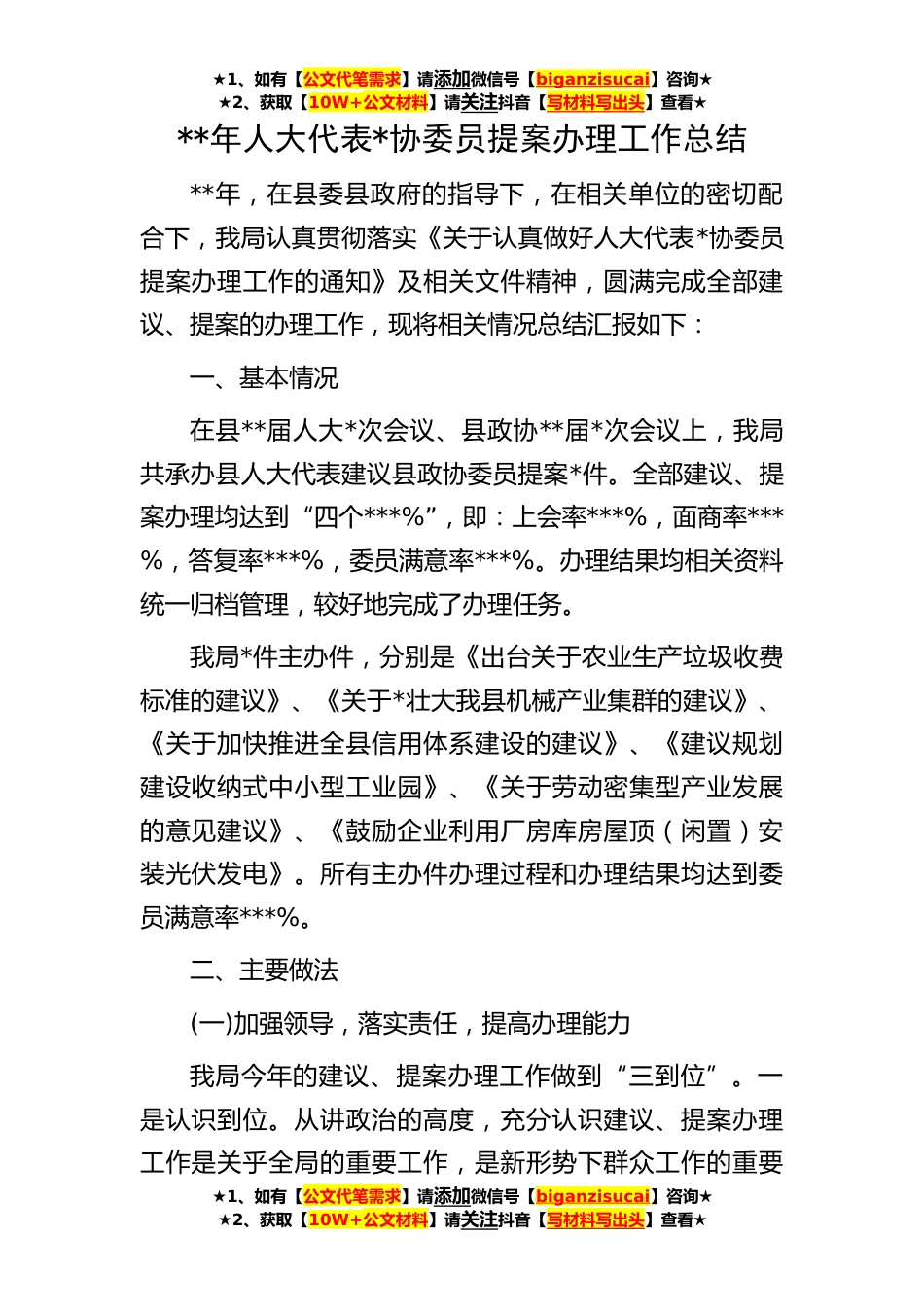 ★1、如有【公文代笔需求】请添加微信号【biganzisucai】咨询★★2、获取【10W+公文材料】请关注抖音【写材料写出头】查看★★1、如有【公文代笔需求】请添加微信号【biganzisucai】咨询★★2、获取【10W+公文材料】请关注抖音【写材料写出头】查看★★1、如有【公文代笔需求】请添加微信号【biganzisucai】咨询★★2、获取【10W+公文材料】请关注抖音【写材料写出头】查看★**年人大代表*协委员提案办理工作总结**年,在县委县政府的指导下,在相关单位的密切配合下,我局认真贯彻落实《关于认真做好人大代表*协委员提案办理工作的通知》及相关文件精神,圆满完成全部建议、提案的办理工作,现将相关情况总结汇报如下:一、基本情况在县**届人大*次会议、县政协**届*次会议上,我局共承办县人大代表建议县政协委...
