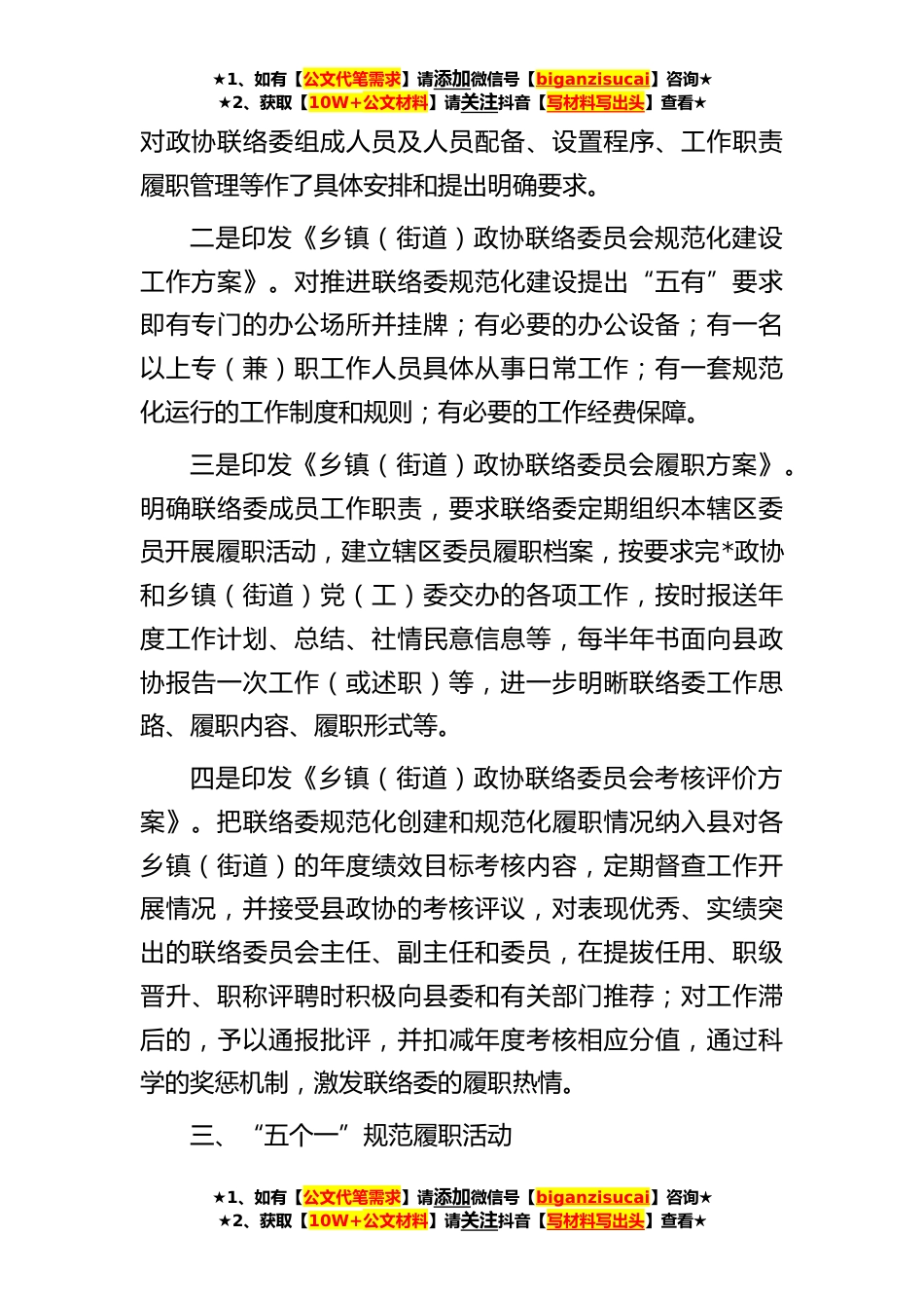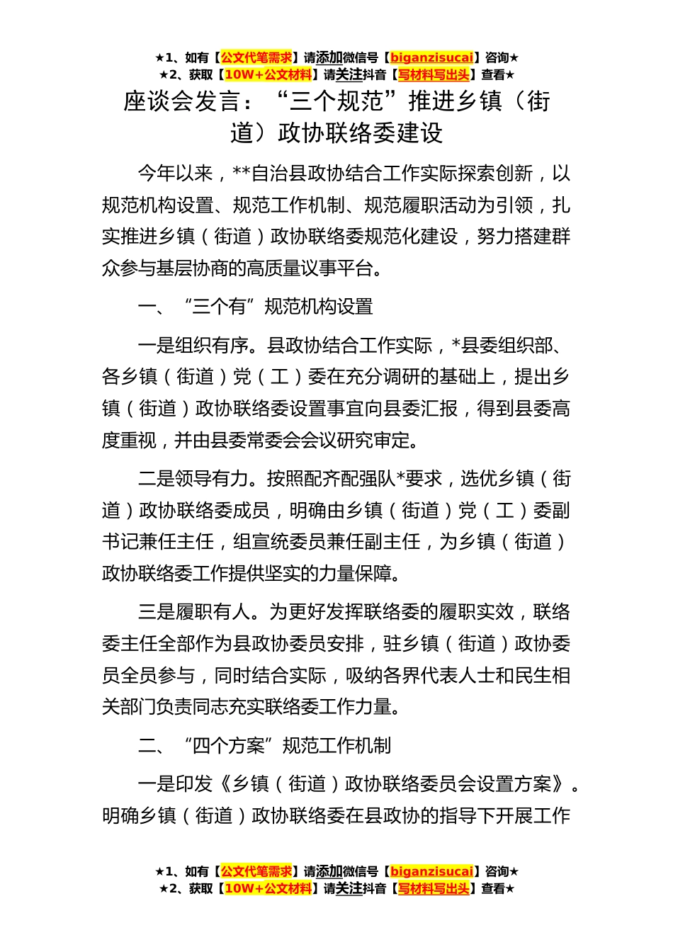 ★1、如有【公文代笔需求】请添加微信号【biganzisucai】咨询★★2、获取【10W+公文材料】请关注抖音【写材料写出头】查看★座谈会发言:“三个规范”推进乡镇(街道)政协联络委建设今年以来,**自治县政协结合工作实际探索创新,以规范机构设置、规范工作机制、规范履职活动为引领,扎实推进乡镇(街道)政协联络委规范化建设,努力搭建群众参与基层协商的高质量议事平台。一、“三个有”规范机构设置一是组织有序。县政协结合工作实际,*县委组织部、各乡镇(街道)党(工)委在充分调研的基础上,提出乡镇(街道)政协联络委设置事宜向县委汇报,得到县委高度重视,并由县委常委会会议研究审定。二是领导有力。按照配齐配强队*要求,选优乡镇(街道)政协联络委成员,明确由乡镇(街道)党(工)委副书记兼任...