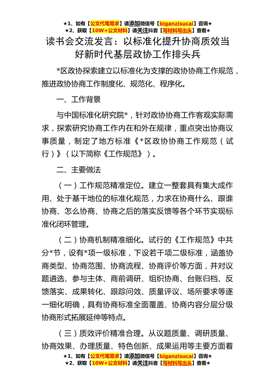 ★1、如有【公文代笔需求】请添加微信号【biganzisucai】咨询★★2、获取【10W+公文材料】请关注抖音【写材料写出头】查看★★1、如有【公文代笔需求】请添加微信号【biganzisucai】咨询★★2、获取【10W+公文材料】请关注抖音【写材料写出头】查看★★1、如有【公文代笔需求】请添加微信号【biganzisucai】咨询★★2、获取【10W+公文材料】请关注抖音【写材料写出头】查看★读书会交流发言:以标准化提升协商质效当好新时代基层政协工作排头兵*区政协探索建立以标准化为支撑的政协协商工作规范,推进政协协商工作制度化、规范化、程序化。一、工作背景与中国标准化研究院*,针对政协协商工作客观实际需求,探索研究协商工作内在和外在规律,重点突出协商议事质量,制定了地方标准《*区政协协商工作规范(试行)》...