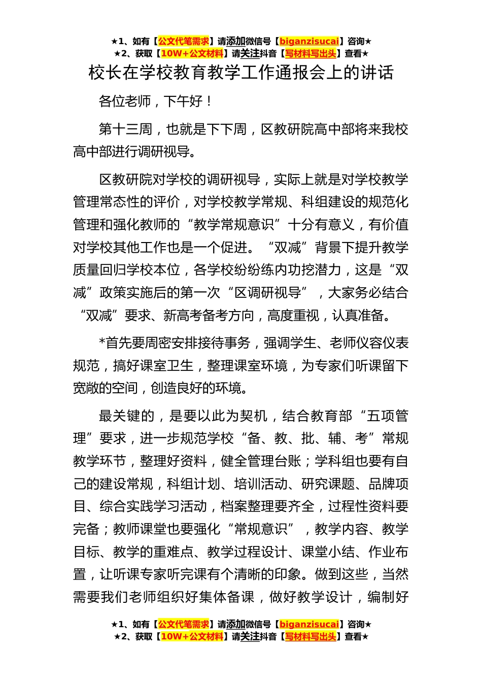 ★1、如有【公文代笔需求】请添加微信号【biganzisucai】咨询★★2、获取【10W+公文材料】请关注抖音【写材料写出头】查看★校长在学校教育教学工作通报会上的讲话各位老师,下午好!第十三周,也就是下下周,区教研院高中部将来我校高中部进行调研视导。区教研院对学校的调研视导,实际上就是对学校教学管理常态性的评价,对学校教学常规、科组建设的规范化管理和强化教师的“教学常规意识”十分有意义,有价值对学校其他工作也是一个促进。“双减”背景下提升教学质量回归学校本位,各学校纷纷练内功挖潜力,这是“双减”政策实施后的第一次“区调研视导”,大家务必结合“双减”要求、新高考备考方向,高度重视,认真准备。*首先要周密安排接待事务,强调学生、老师仪容仪表规范,搞好课室卫生,整理课室环境,...